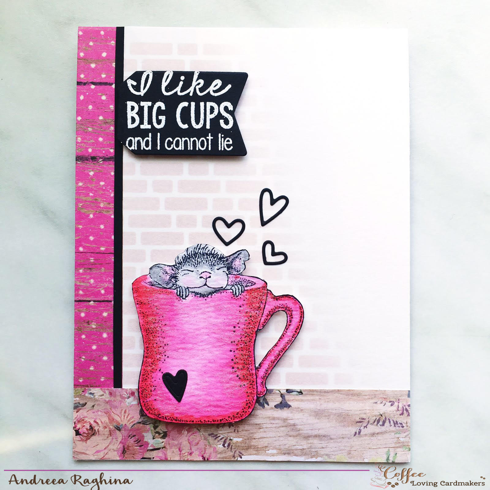 The coffee cup with the little mouse is stamped on Ranger watercolor paper and colored with Gansai Tambi watercolors and Wink of Stella in pink color. I fussy cut the coffee cup and adhered it to the background with foam, for a bit of dimension.
