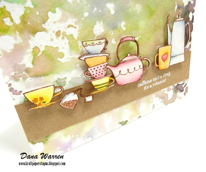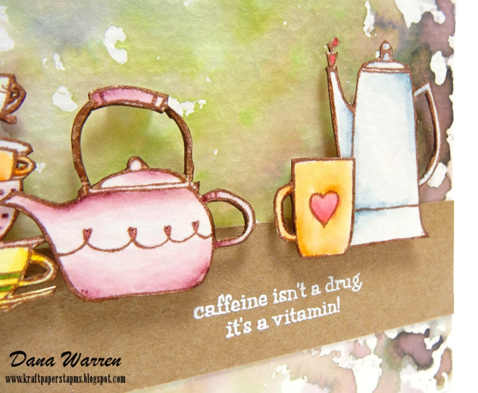 To give the images a shelf or top to sit on I cut a strip of Kraft card stock. I embossed the sentiment Caffeine Isn’t a Drug, It’s a Vitamin (so true, right?!?!) in white. I adhered the strip directly on the panel, then added all the tea cups, mugs and pots with foam tape. With such a busy background I decided against adding sequins or enamel dots.