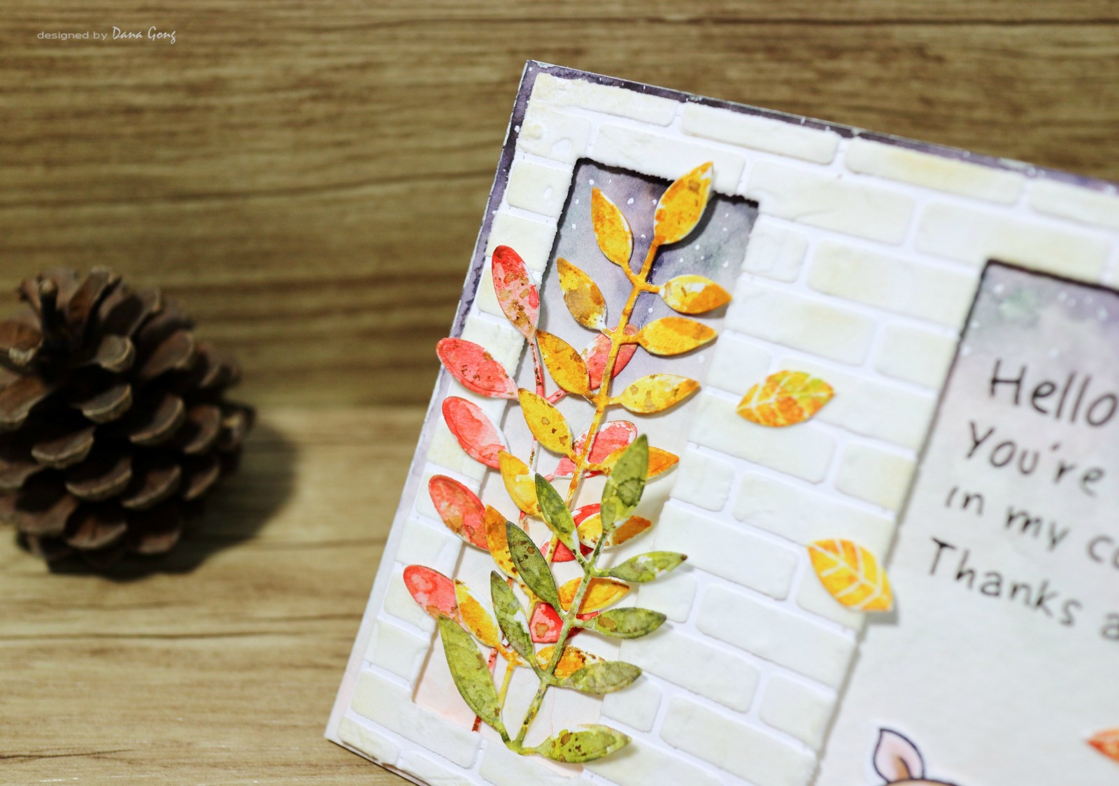 I die cut 3 big leaves and watercolored them using distress inks (Barn