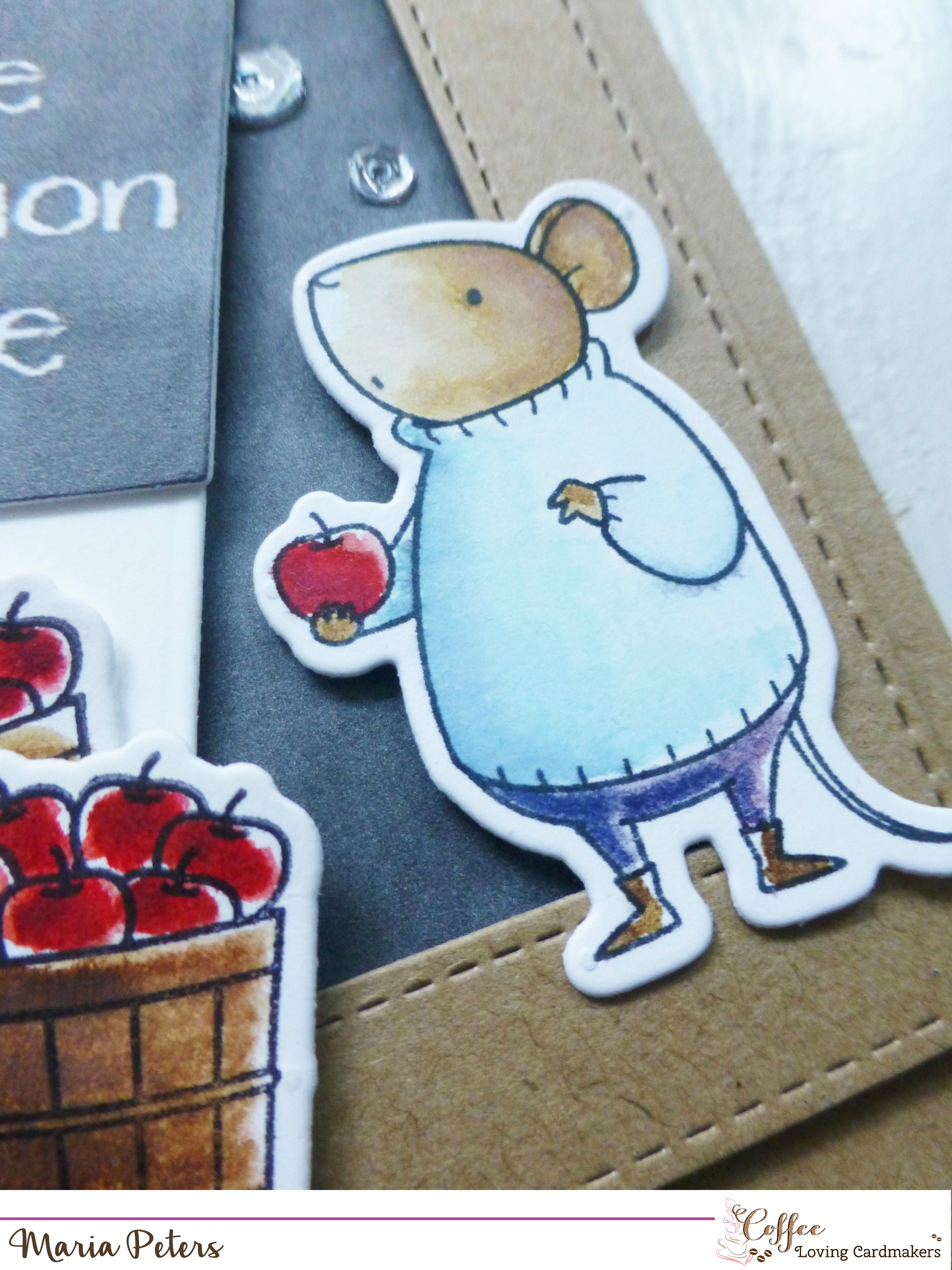 From the chalkboard, to the wee mouse (love his sweater!), to the apples and spice (the fragrance…I can detect it as I type), this card is absolutely warm-and-fuzzy marvelous! Love it, Maria!