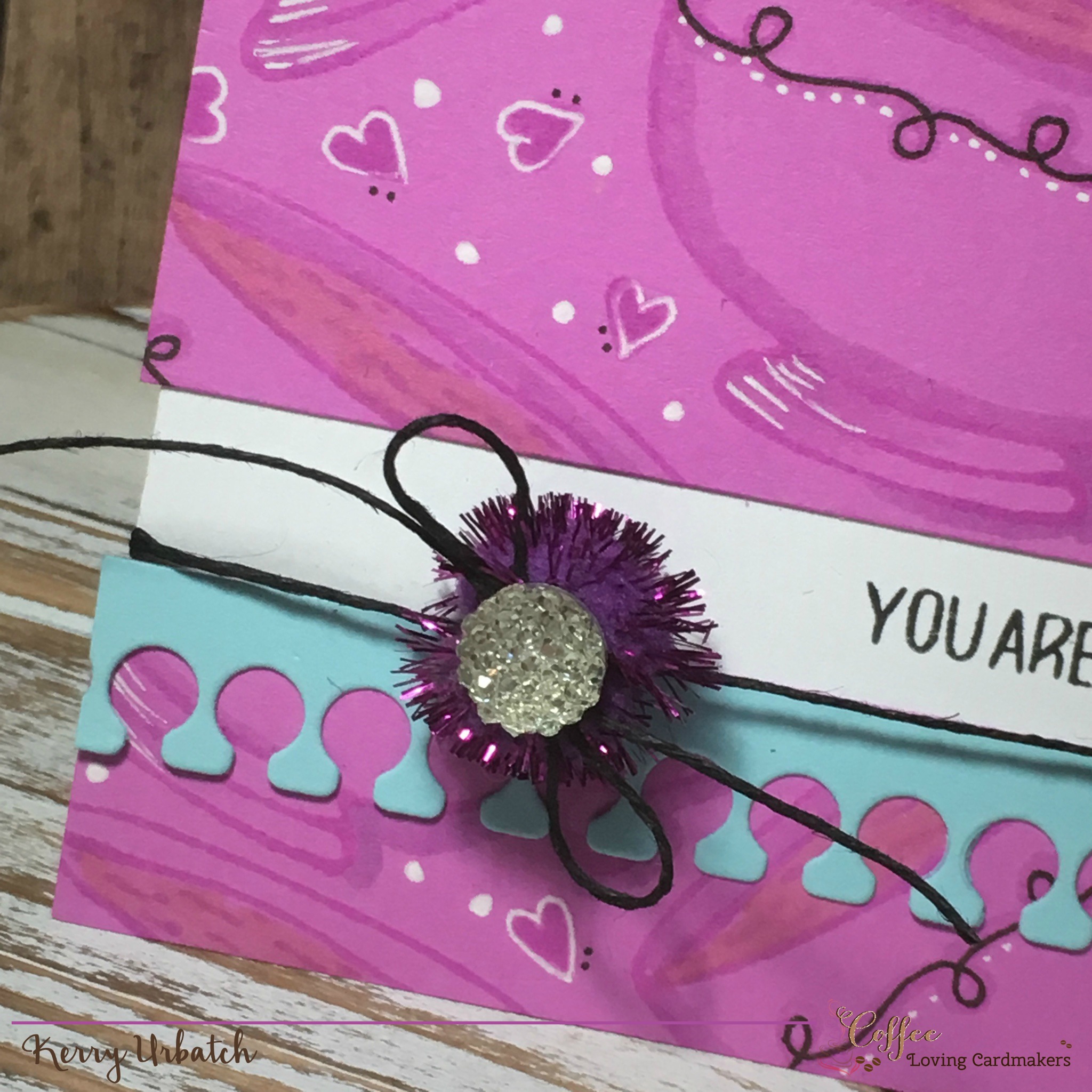 For today’s project, I decided to do something simple and much less elaborate than most cards I make.  I guess you can say, I’m focusing on the hop!  Anyway, I still LOVE how today’s card turned out and of course, I created a quick-and-simple coordinating sketch to accompany it!  Hope you enjoy!12-3-clsipTo create this card, I started out by selecting a fun paper color combo.  I chose Cosmic Grape and Pool Play cardstock from Fun Stampers Journey.  I cut the paper to create a square card base then got to stamping the background using Cosmic Grape ink and a fun set from Whimsy Stamps called “Need More“.  I love the look of the hand-drawn cup and thought it would work perfectly with some tone-on-tone coloring.  12-3-clcsipAfter the background was stamped, I colored the cups using a few Copic Markers (BV00, V12 and E11).  I also used a white Gelly Pen and a Micron pen to draw additional doodly marks on the images and pattern.  I also added a the diecut (Spiral Notebook Border Die) that I got for a steal of a deal $1.00 during one of their sneaky dollar-deals section recently.  12-3-clcsip-cornerI cut the front of the stamped card base so I could create a white sentiment panel.  It’s similar to a floating panel but a bit more simple.  After stamping the sentiment with Black Licorice ink, I was able to tie a little sparkly pom pom and a little Sparkle Drop onto the card using some Black Licorice Twine.