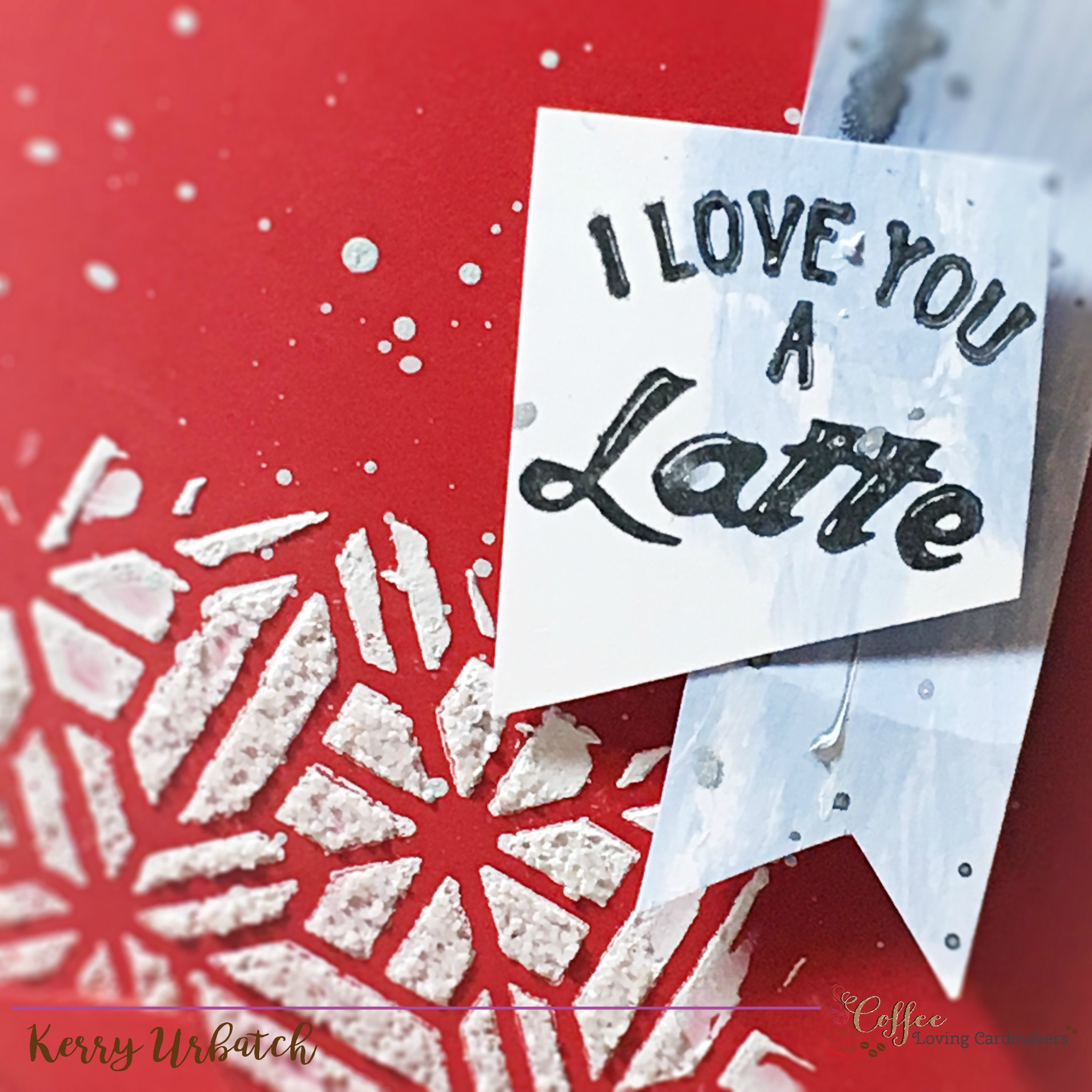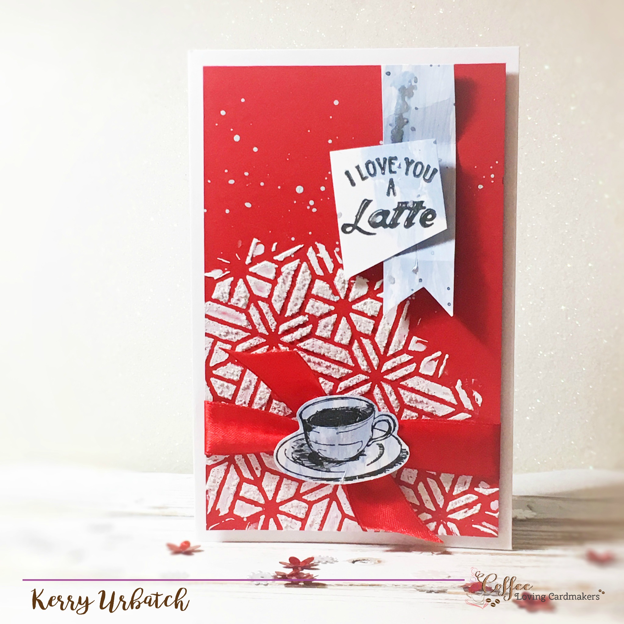 Hello there coffee loving cardmakers!  It’s Kerry here for another Sunday Sip and Share.  I’m sharing a YUMMY card I created during a fun event with some of my fellow Fun Stampers Journey Coaches.  My goal was to share different ways you could modify modeling paste and gesso to create fabulous texture and color.  When sharing live on video, I created some swatches of yummy goodness and this red background (and the light blue elements) were the result of my demonstration.  I knew exactly what I was going to use the background for!!!  CLC1.15To create the deelish textured background, I first rubbed Modeling Paste over the Stained Glass Stencil on some Candy Apple Cardstock.  Before removing the stencil, I sprinkled some sand over the top.  I rubbed it into the modeling paste and then removed the stencil.  After rubbing off excess sand with my finger, I splattered some watered down modeling paste onto the panel.  I then let the background dry.