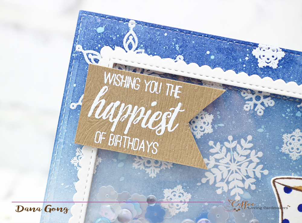 I started by white heat embossing the snowflakes from SSS Lots of snowflakes stamp set onto the watercolor paper. After ink blending the background with dye inks and distress inks, I splattered a bit of water using mini mister. Once it dried completely, I die cut scalloped frames and shaker window.
