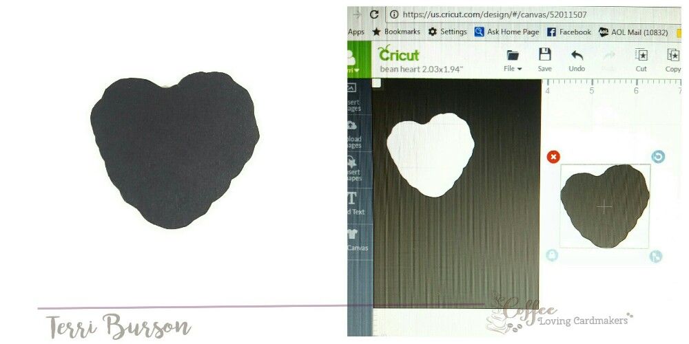 I often use a free online file converter that allows you to convert a jpg photo into an svg cutting file. I’ll try to explain as best as I can. I thought I would simplify the process by tracing the outline of the bean heart from this stamp set onto black card stock and fussy cutting. Here’s the next few steps:
