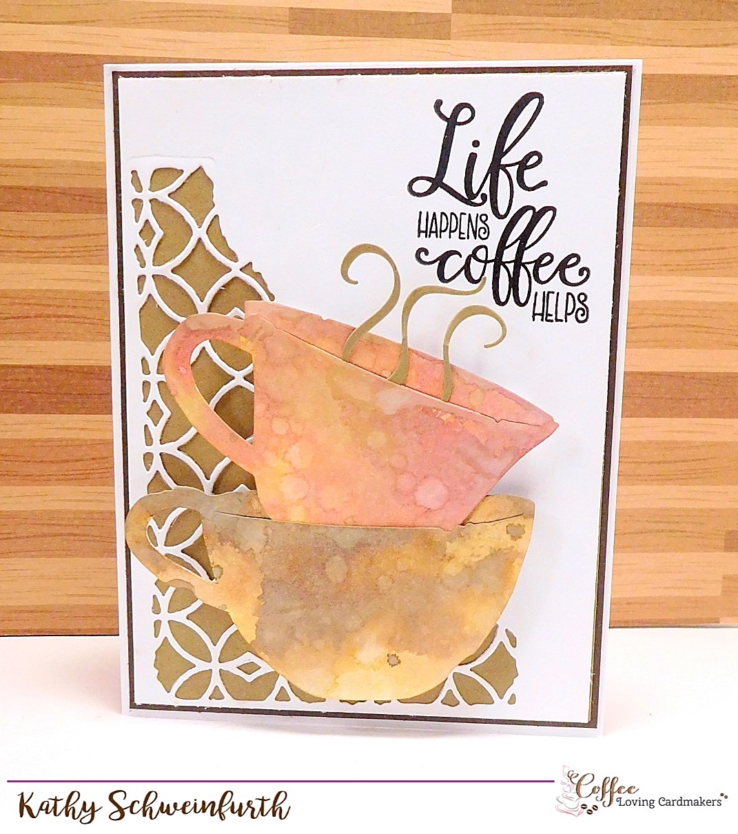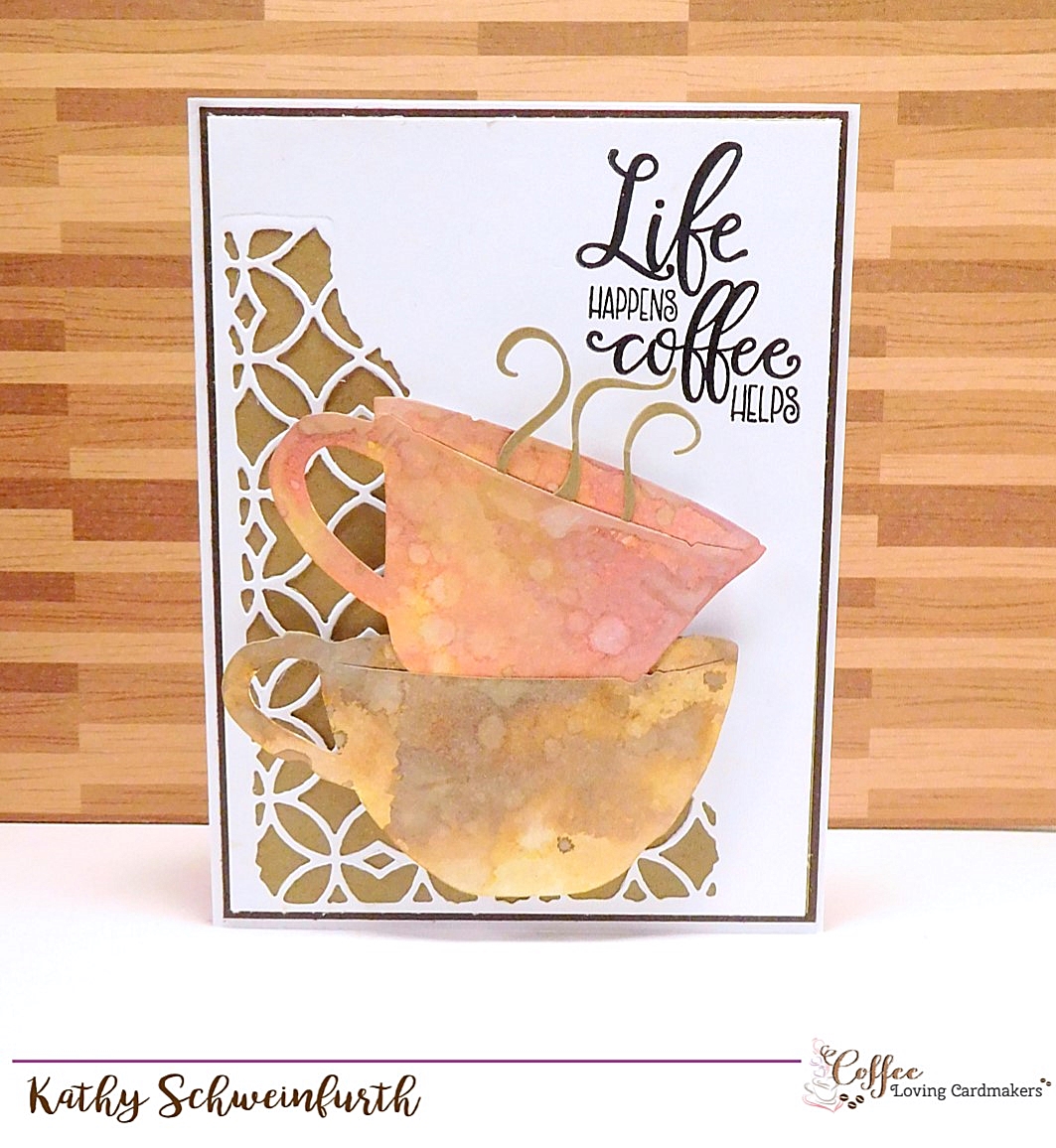 For my card, I chose this Tim Holtz Bigz die, Tea Time, which I found on clearance at JoAnn Fabrics recently. Using the new Distress Oxide ink pads, I water colored the cups. The side was created with Tim Holtz Mix Media Thinlit Die. The sentiment is from Verve Stamps’ set Coffee Helps.