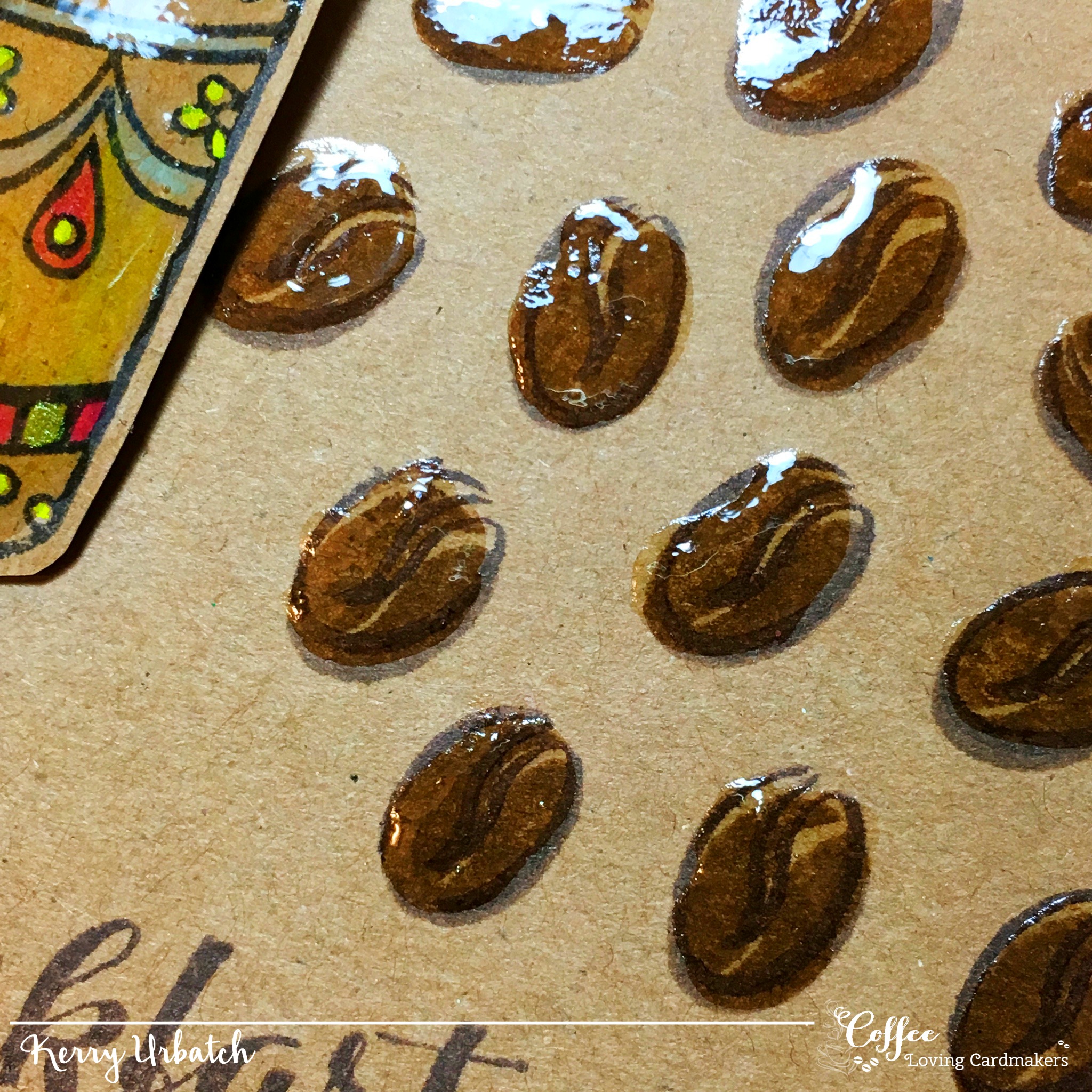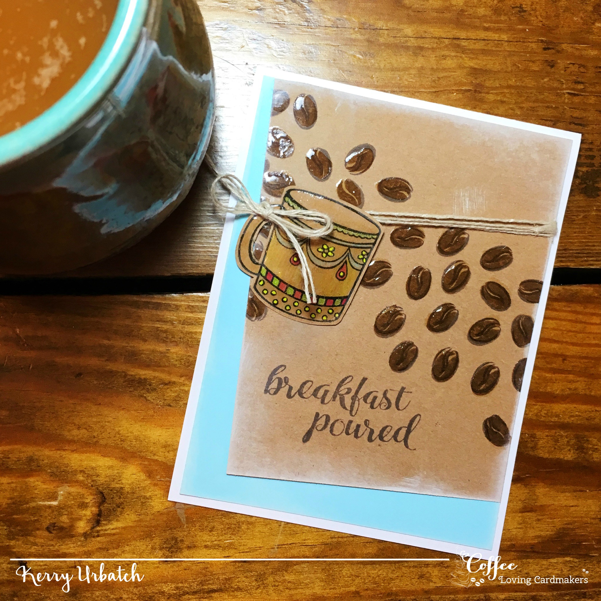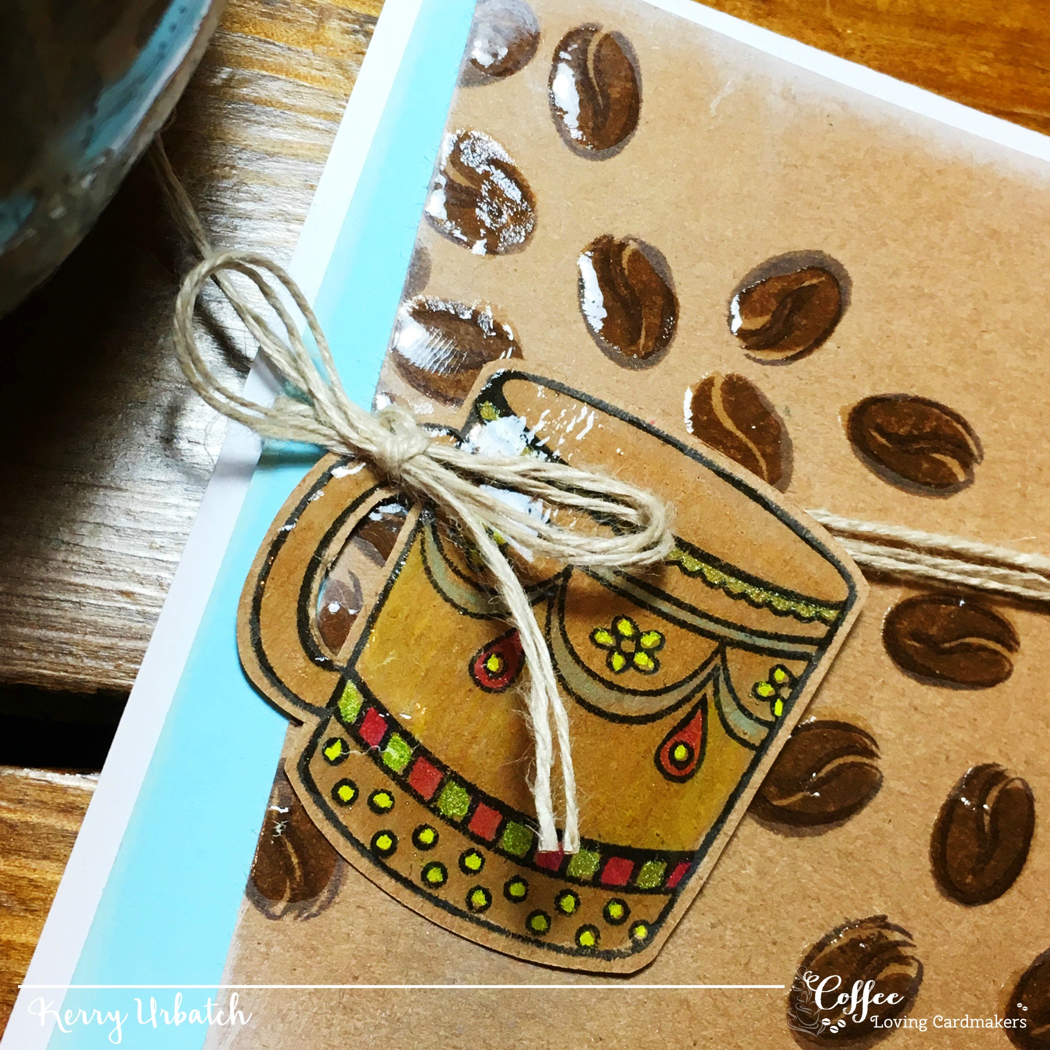 I stamped the beans onto kraft cardstock and then added some glaze to make them shiny. I also stamped the sentiment on this panel. I also colored the coffee cup with watercolors and some opaque markers. I fussy cut the cup so that I could attach it to the card using twine.