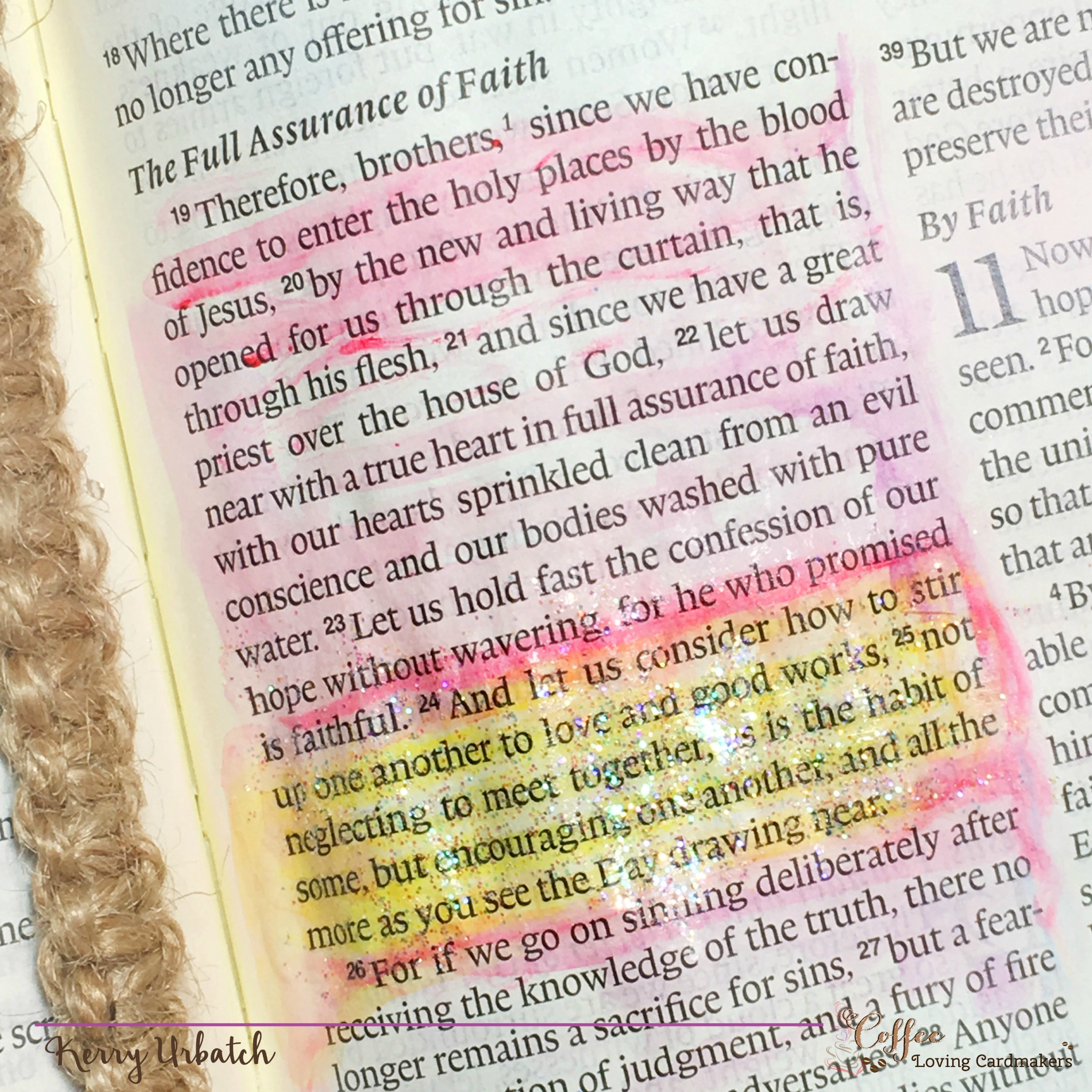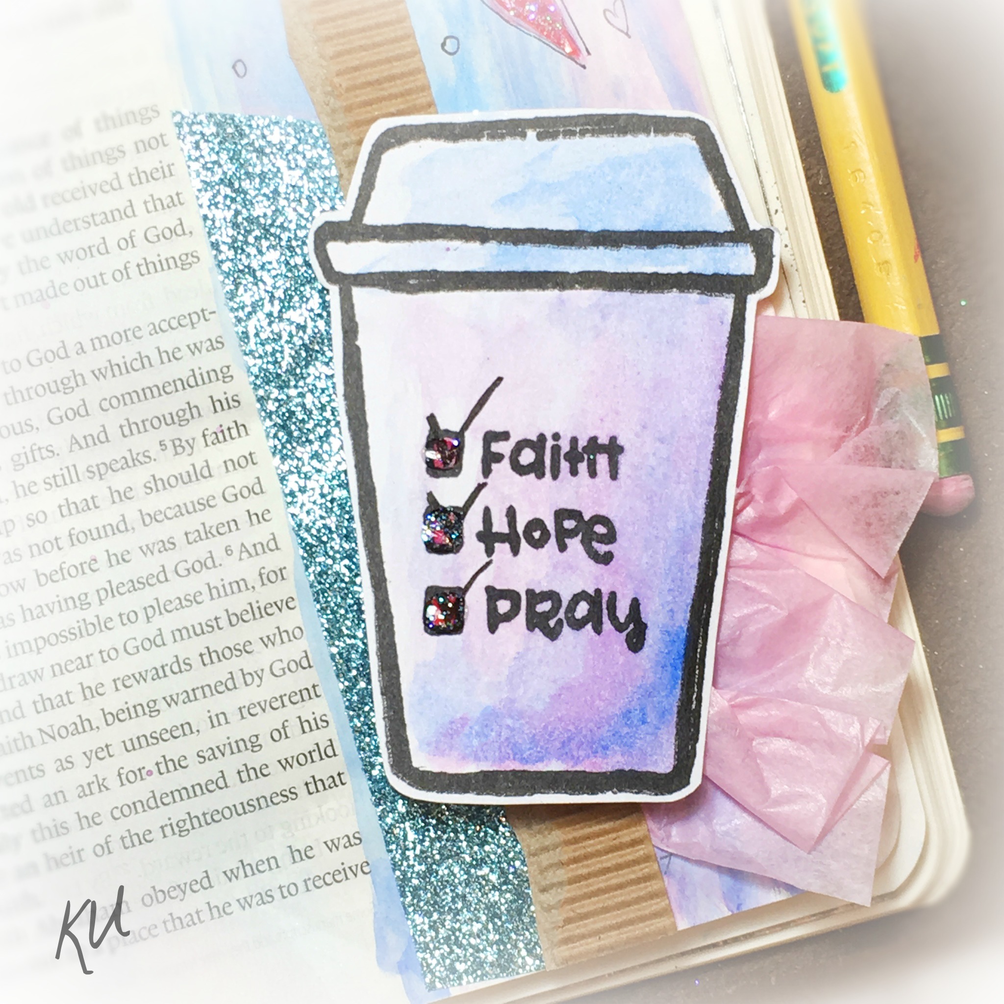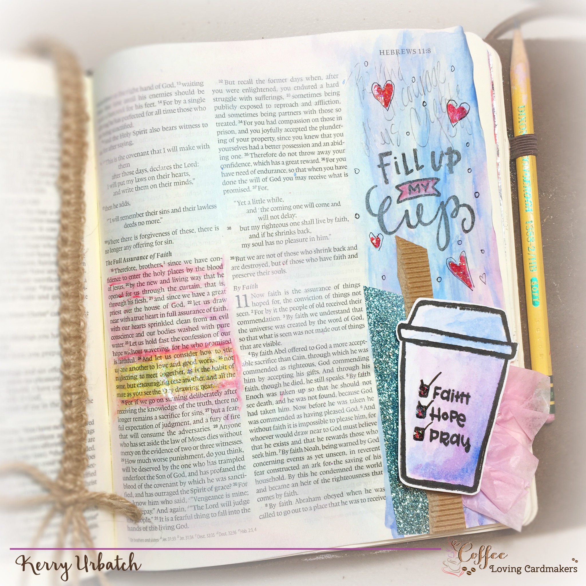 The sentiment on the coffee cup “Stir Up My Heart” inspired my search for the perfect Bible Verse and I found it in Hebrews 10:24-25.  This verse was a good reminder to me.  This stamp set called Fill me Up from Sweet n’ Sassy (Creative Worship series).  I stamped the cups onto white cardstock, added some watercolor and cut them out. After that, I watercolored the pages and highlighted the scripture.