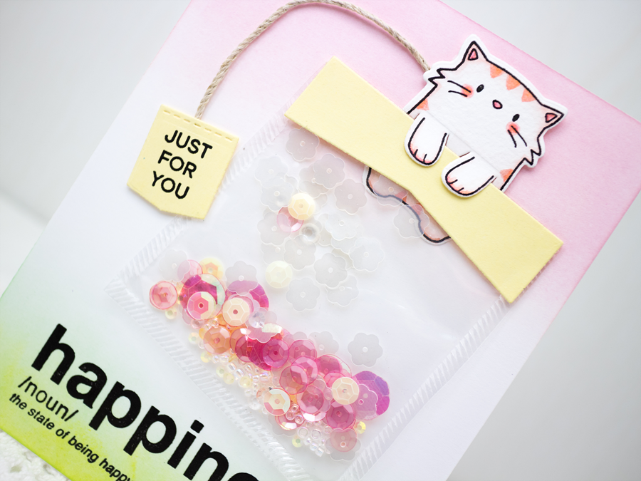 Then, I stamped sentiments. Big sentiment ‘Happiness’ is from MME Words Defined stamp set and small sentiment on the tea bag tag is from MFT LLD Cup of tea stamp set.