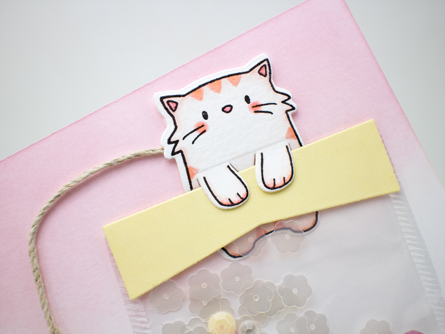 Next, I stamped cat from MME Page Huggers stamp set onto the watercolor paper and colored it with Zig markers using waterbrush. I die cut it using coordinating die set.