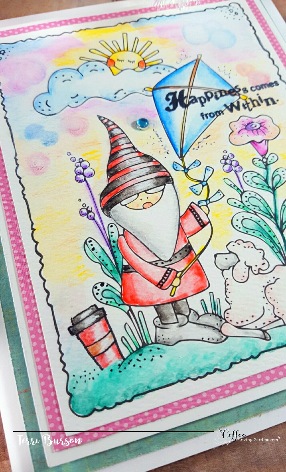 A few key points on my coloring, to make my cotton candy sky, I drew in lots of different sized circles, colored them in, blotted with a wet waterbrush and paper towel, then dabbed on white pigment ink. You could use white chalk ink as well. For my gnome and cup, I accented my shading with a white gel pen for a whimsical look.