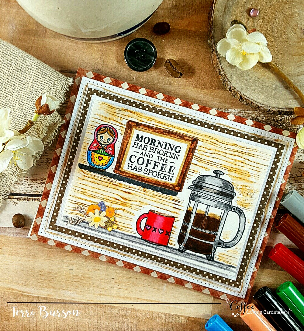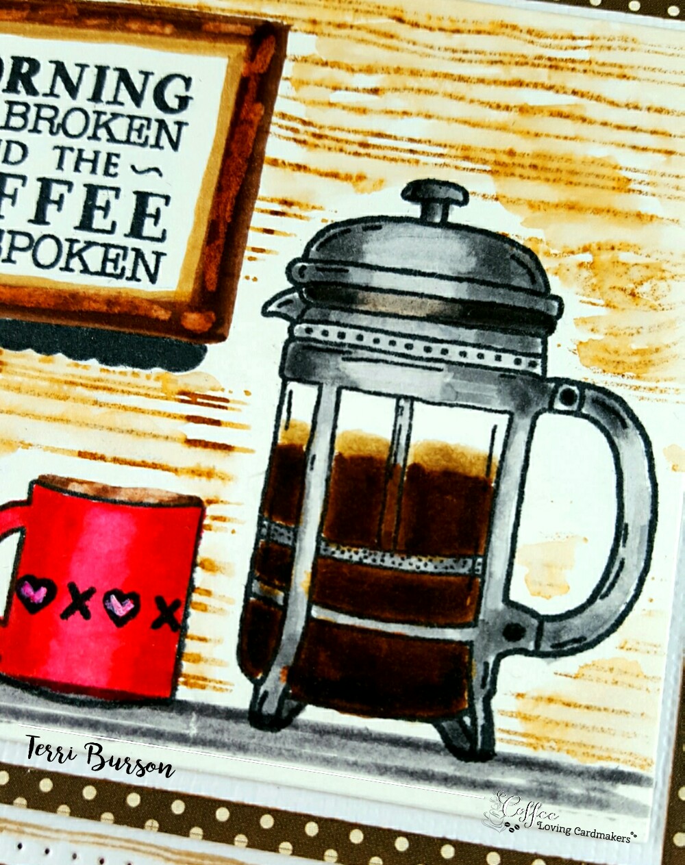 I love this French Press stamp and wanted to include this in my scene. It’s how I drink my coffee every day. I love my French Press! I’m using Tombow dual brush markers for all my coloring today and a waterbrush as well.