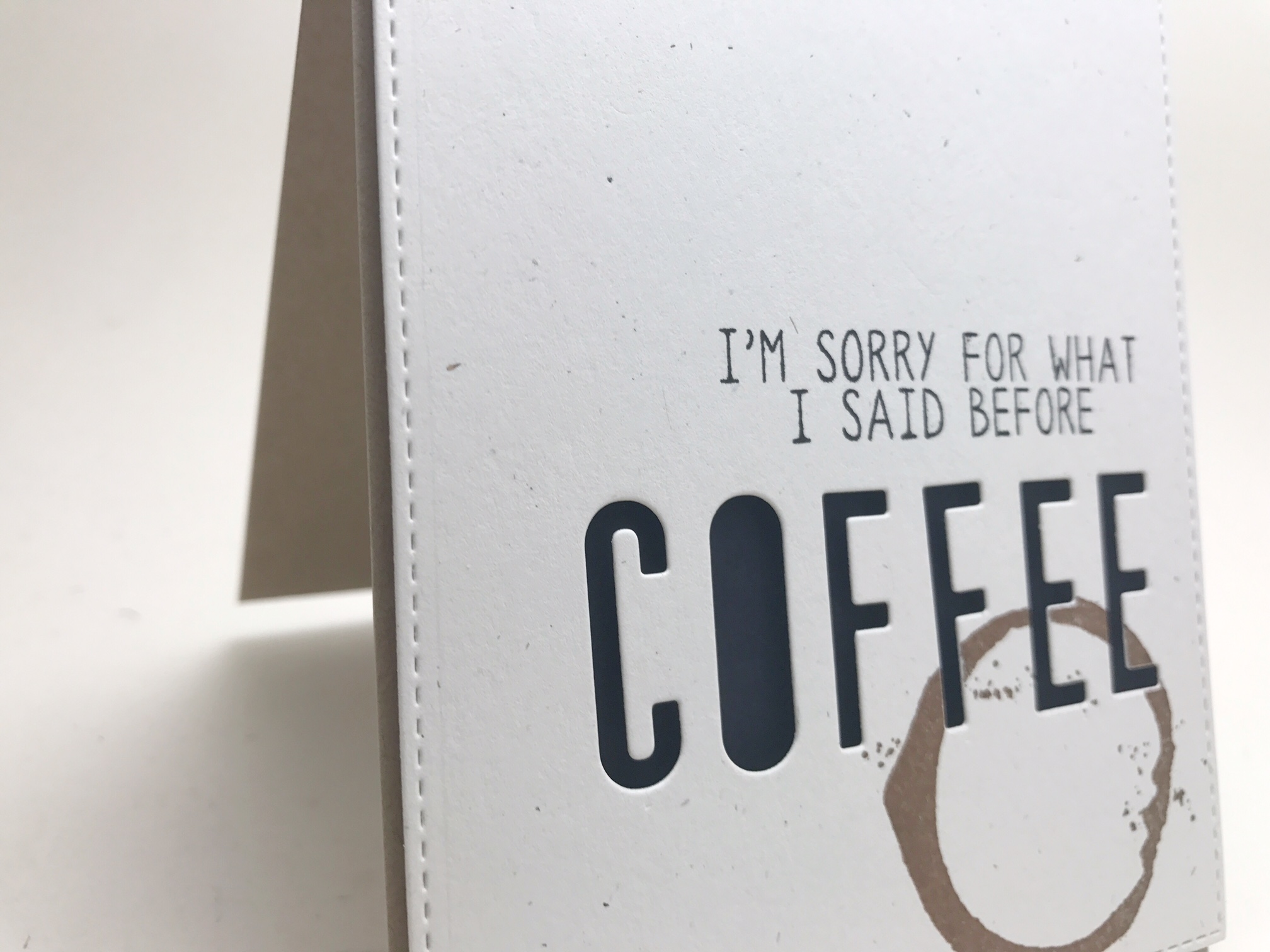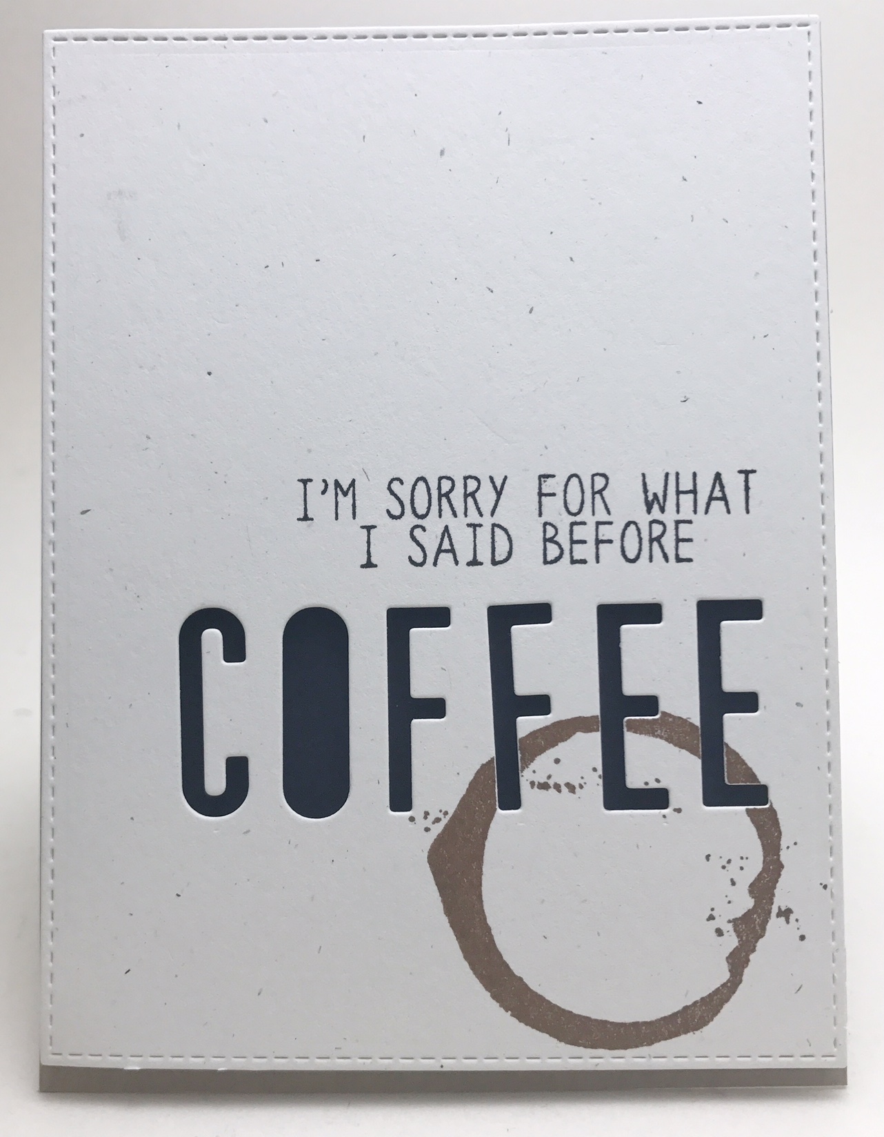 Erin, from Homemade Cards by Erin, and I’m excited to share this CAS coffee card today. One of the things I love about the crafty blogland is that I often get new ideas with products I already have. Tracy and Jennifer recently posted about alphabet dies and it made me realize that I have multiple sets, but because I am prone to misplacing things (hence the Creative Chaos), I hadn’t taken the sets apart to write a word as a negative (I’d only used the letters to spell things out as an addition), so I got to think about coffee….. In our household I am constantly trying to have productive conversations with my husband before he’s had his coffee (the problem with having been up for hours before him), so I really need a sentiment, “I’m sorry for what I said before YOU HAD Coffee’- but I think he’d still appreciate this. The card combines the Reverse Confetti Love of Latte sentiment with PTI dies and an Altenew coffee ring.