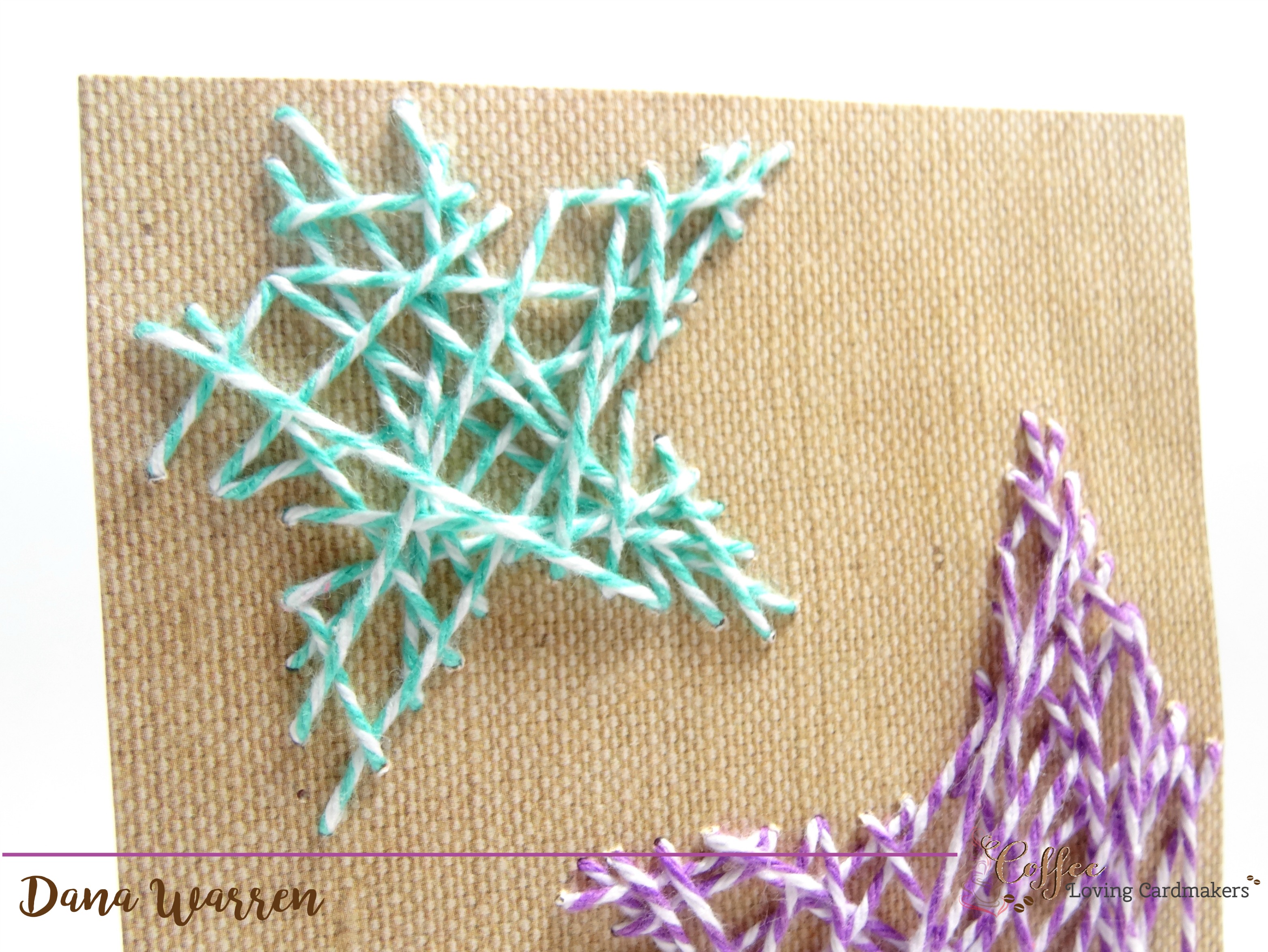 Then I threaded a need with twine and went about stitching the stars. I decided to fill in the stars some, rather than outline them. I used Pink Sorbet, Lilac and Caribbean colors for my stars.