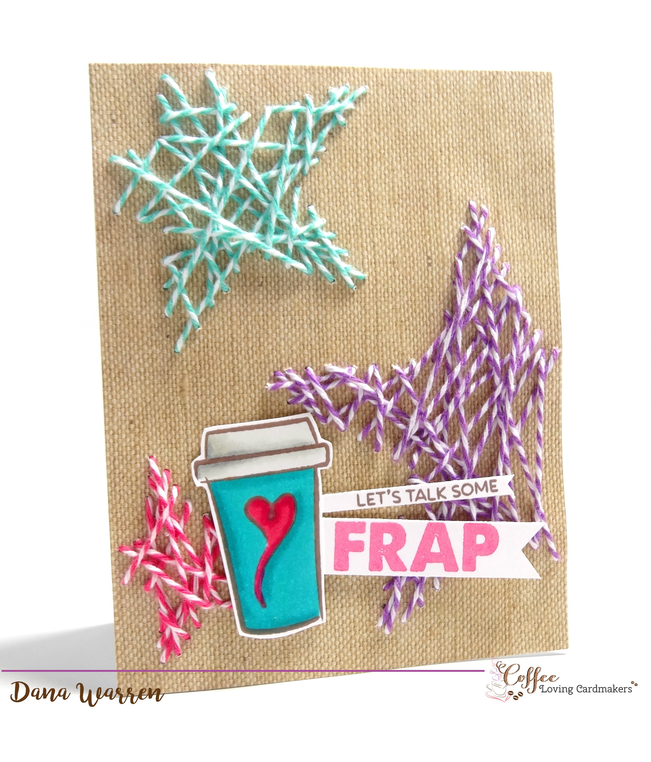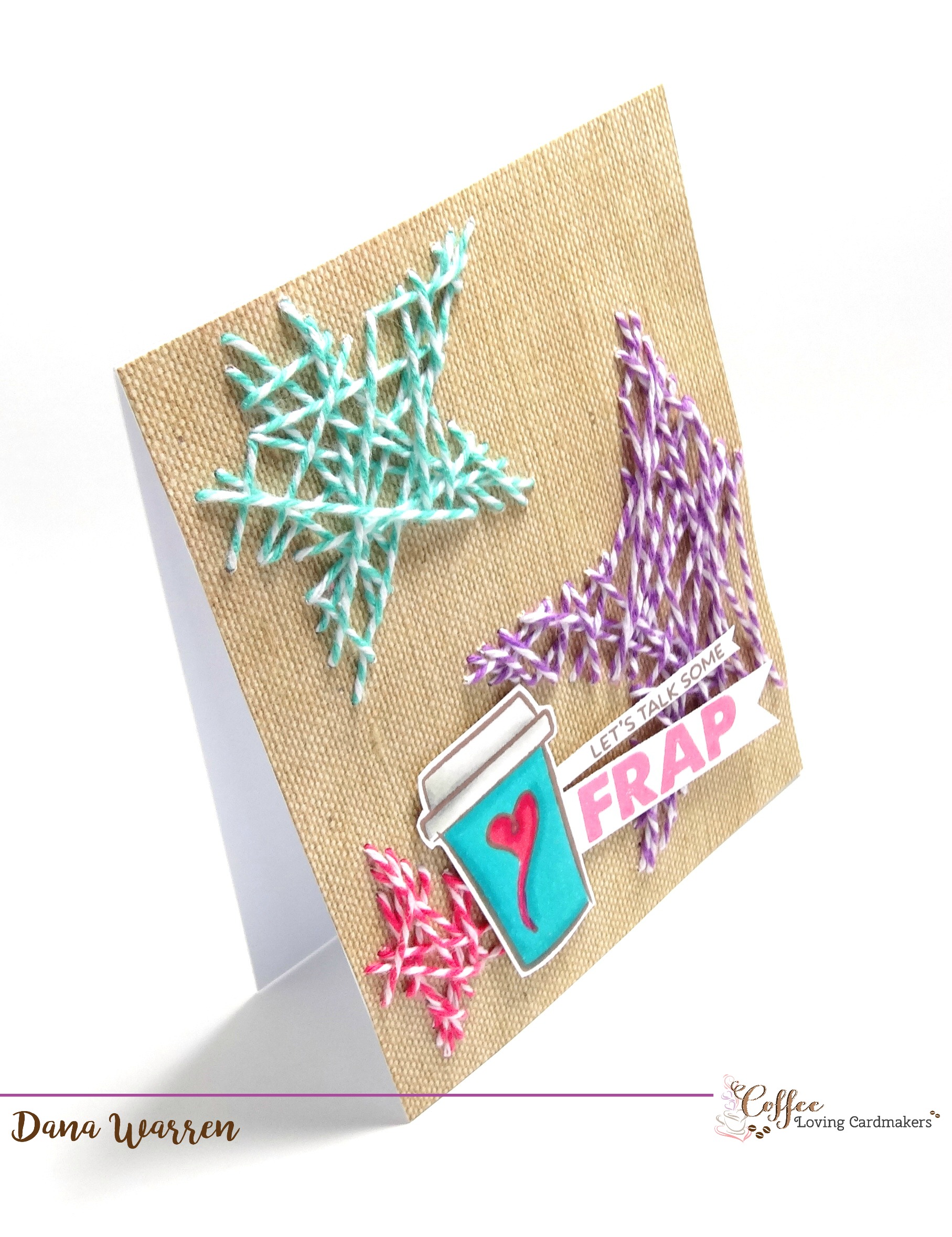 When my stitching was done I stamped the coffee cup from Essentials by Ellen Oh Frappe stamp set. With my Spectrum Noir Markers, I colored it to match my twine stars. Then I just fussy cut it out.