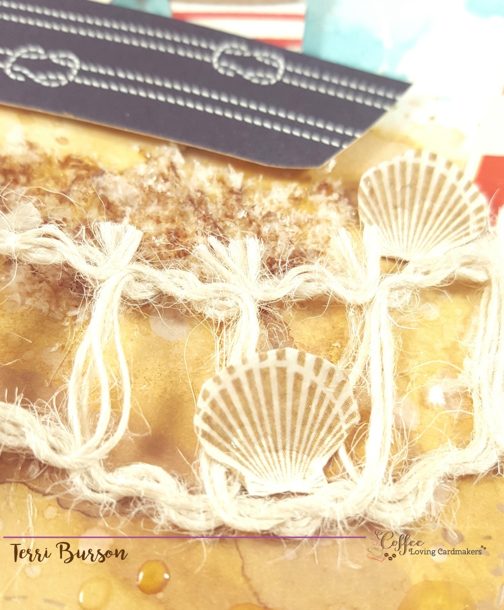 I hand trimmed a little boat for my cups as well. I also distress my paper edges with my Ranger distress tool. The stitched dies are from Stamplorations Running Crazy nesting stitch dies and all adhesives are from Scrapbook Adhesives by 3L. My netting ribbon is from May Arts Ribbon.