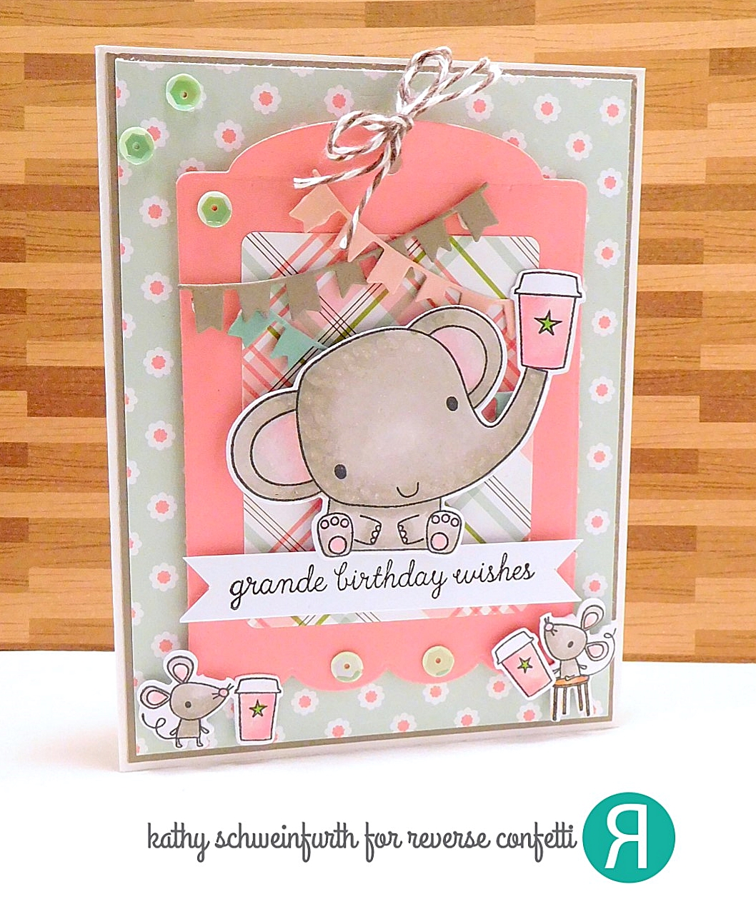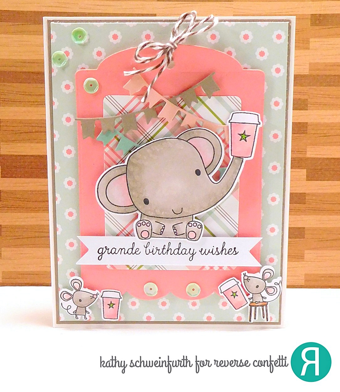 Today my card features lots of Reverse Confetti goodies starting with the Gift Card Holder Tag Confetti Cuts. This is one of my favorite tags and I just love those tiny banners! The adorable elephant and mice images with their cute coffee cups plus sentiment are from the Coffee & You set and coordinating Confetti Cuts.