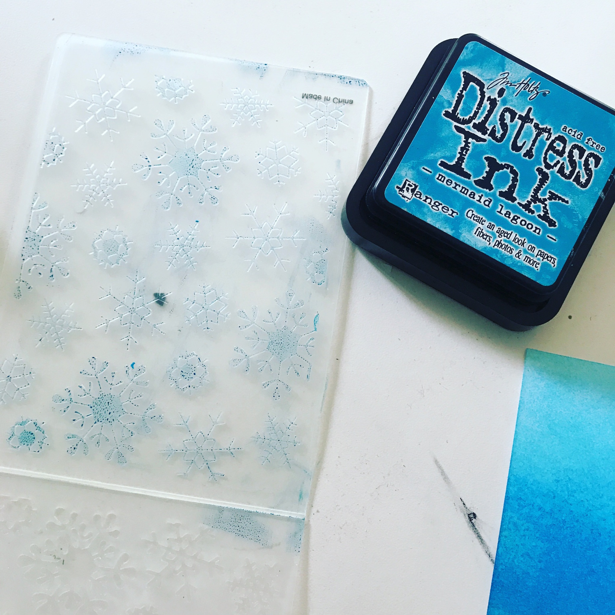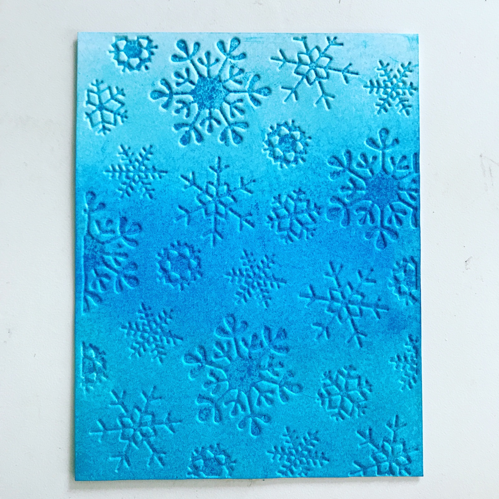 I brushed some of the darkest shade of blue onto a snowflake embossing folder and used it backwards to deboss the pattern into my cardstock.