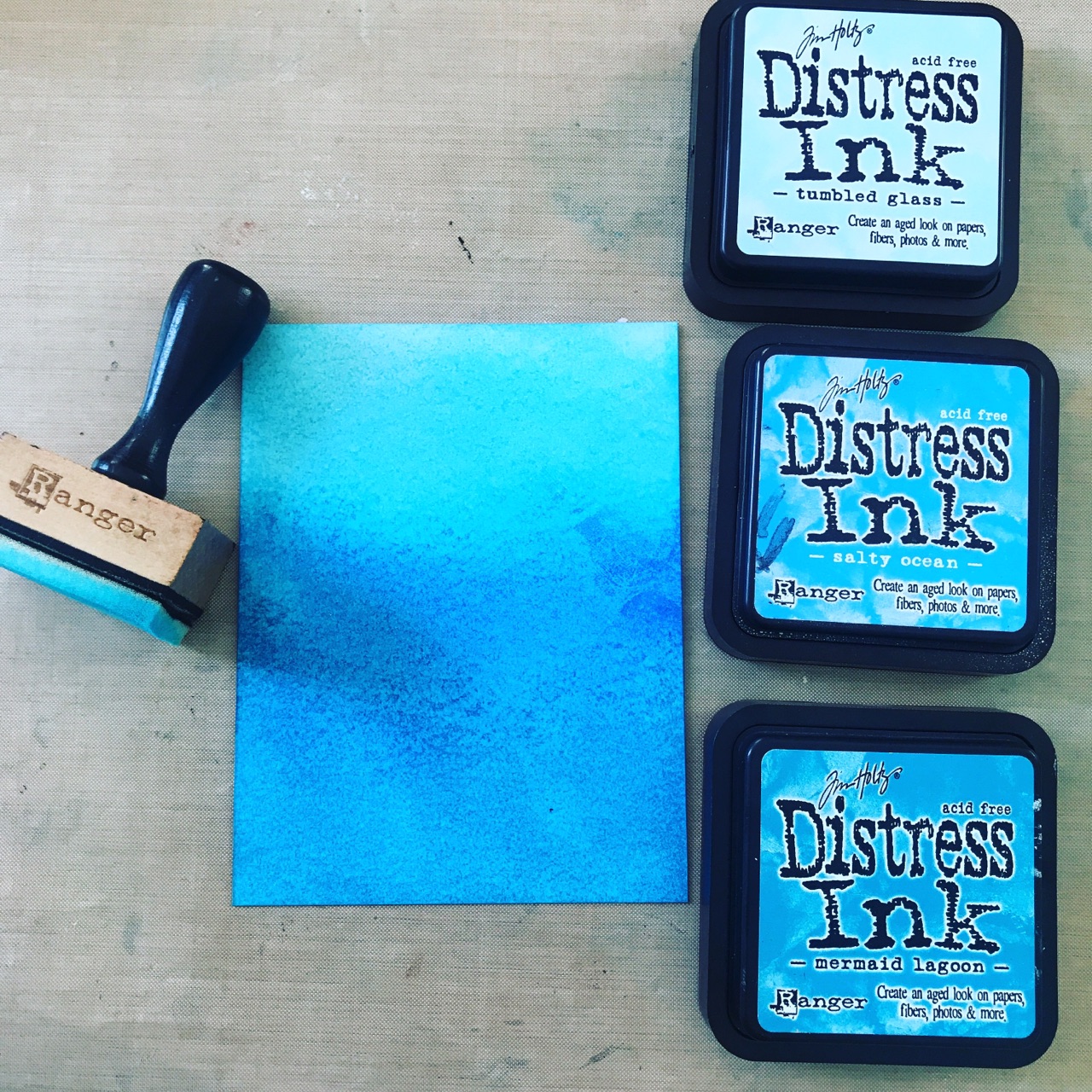 I started my card by sponging a background in cool shades of blue Distress Inks.