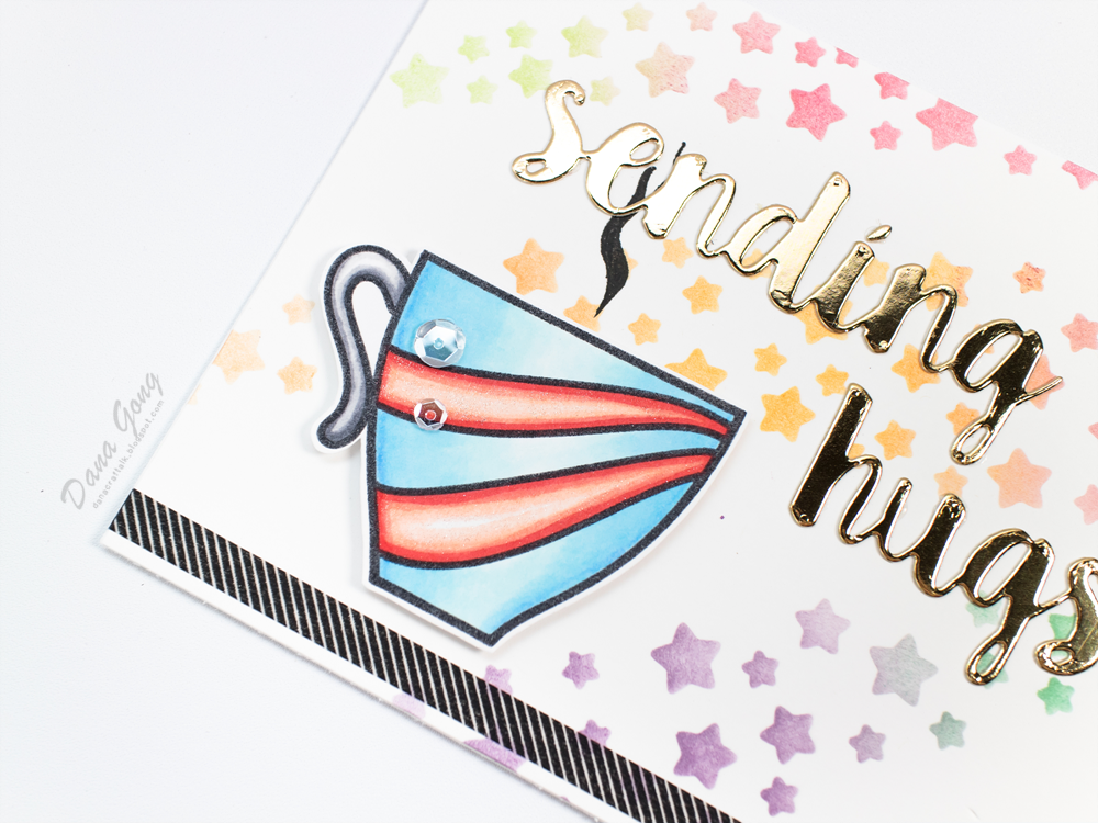 Then, I stamped cup image from Coffee First stamp set onto a piece of paper and colored it with alcohol markers. I applied shimmer on the red wave part using Wink of Stella brush, too.