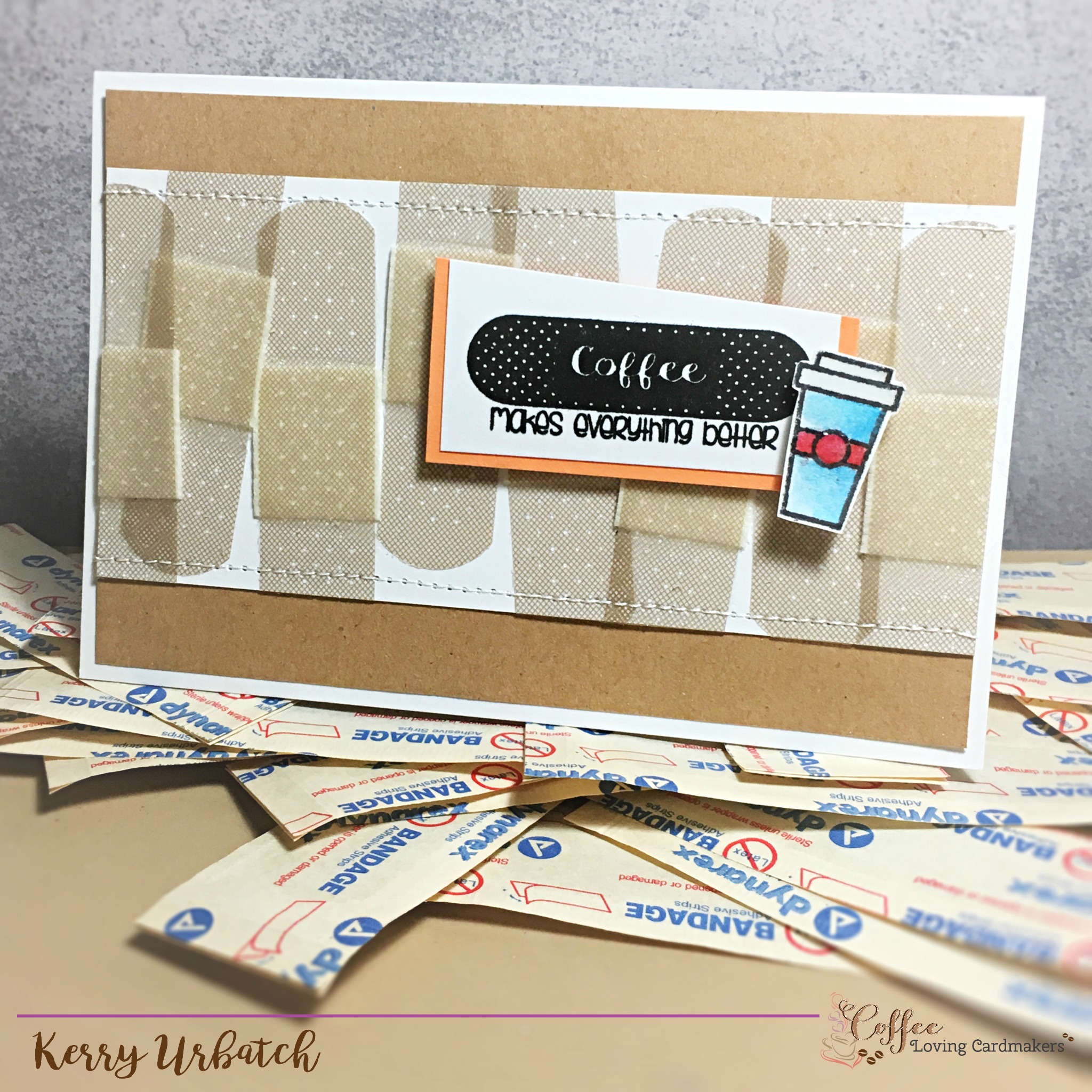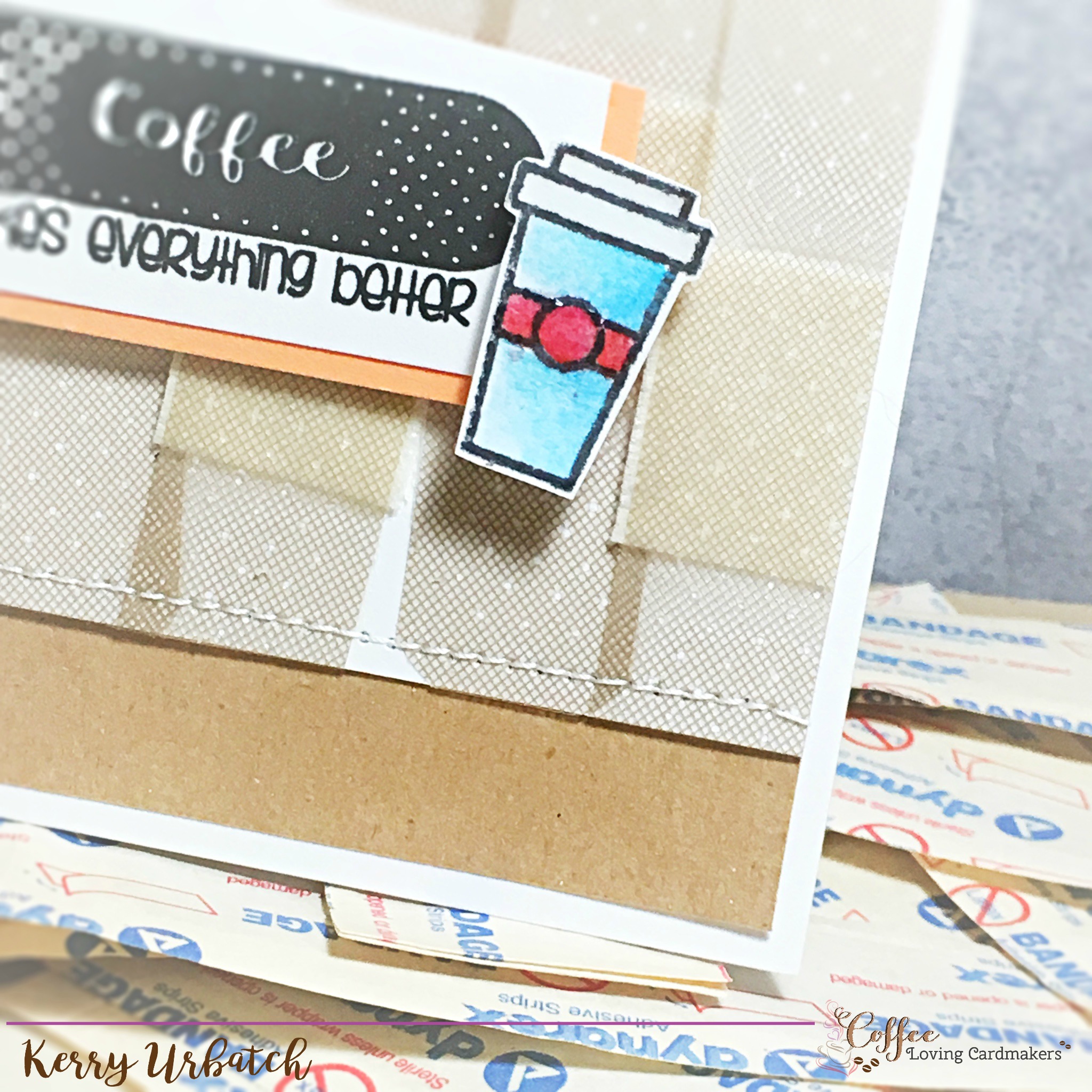 After mounting the sentiment onto the bandage panel, I stamped and colored the coffee tumbler with watercolor pencils. I cut the cup out and added a pop dot to attach it to the sentiment panel. After that, I attached the bandage panel to some Kraft paper (just paper, not cardstock) and mounted the whole thing onto a white card base. Easy, peasy and perfect for a friend in need!