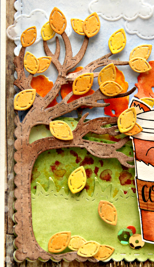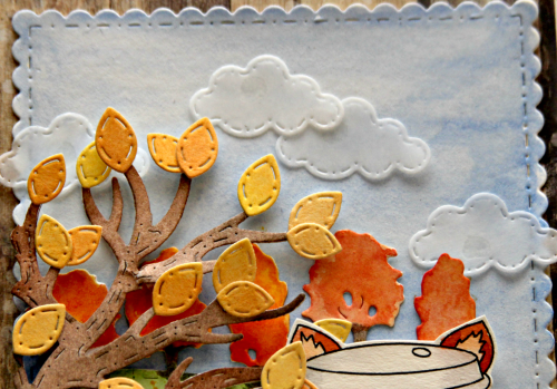 I watercolored each layer before putting them together. I started with my bottom layer and used blue for the sky. Then I cut another rectangle and used the tree line die from the Fall Border Dies to cut my second layer. Then a slightly hilly layer using the Outdoor Landscape Dies, and the grass from the Outdoor Landscape 2 dies. And I was so excited because I ordered the new Scenery Dies from this month’s release on Friday and because of Tara’s lightning speed shipping skills and I live not too far from her, I had the dies in my mailbox the next day! So excited that I got to use it here .. that tree and those leaves… LOVE it!! I popped the tree and the fox cup up to add some depth.