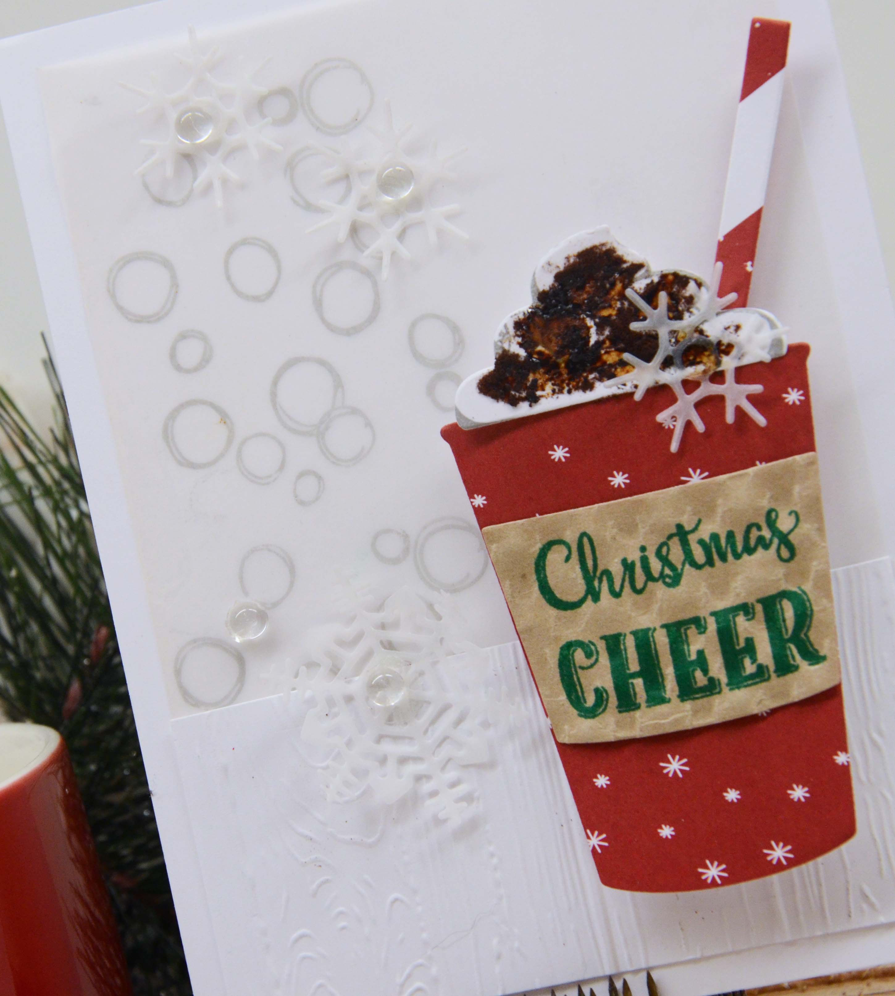 The ‘wrap’ on the cup is actually upcycled packaging I received some stamping goodies in.  I love to upcycle.  Also, I used real coffee as the sprinkes 🙂