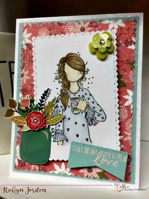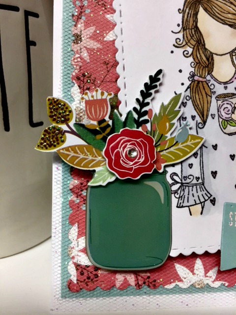 I love her pretty coffee mug! I stamped her with Memento Black ink, and colored her in with Copic markers. I then cut her out using Craftin’ Desert Divas Fancy Frame Dies. I used the same set of dies on the little sentiment, and the background printed piece too. What an amazing set of dies!