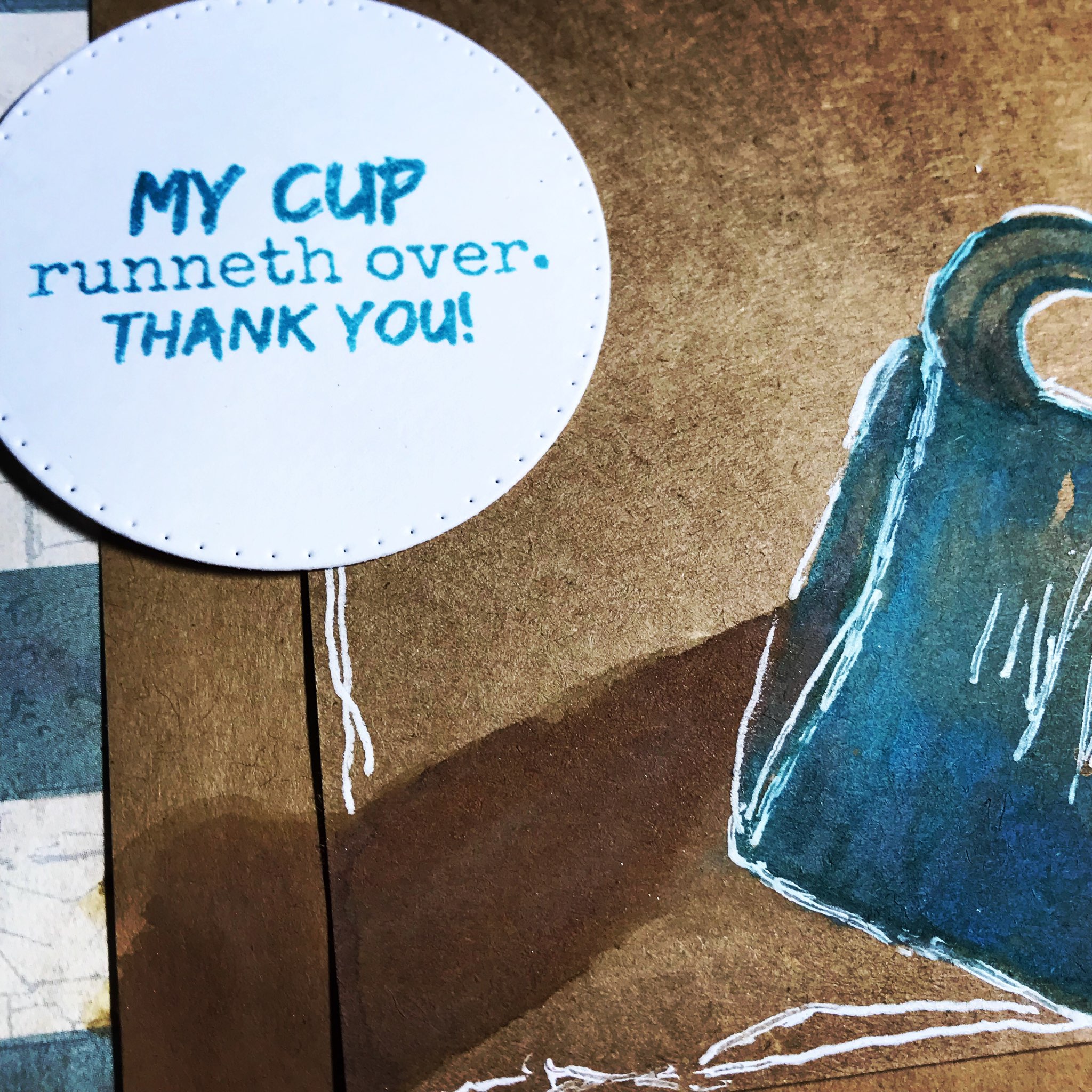 IMG_3033Once I had my blue mug colored up, I added some overflowing coffee, to mimic the design in the Kraft Plus inspiration image. I used both Distress Oxides and regular Distress Inks, just to give the “coffee” a little darker and less chalky of a finish.