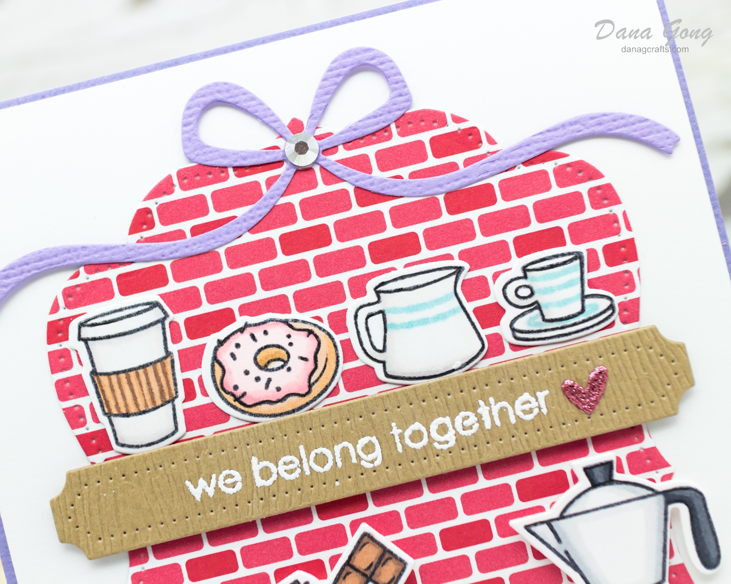 I then die cut pink brick wall from Doodlebug Milk & Cookies paper pad using Studio Katia Dotted Patterns: Darling Ribbon. I also die cut ribbon from violet card stock and banner from woodgrain paper using same die set. I used banners like shelves and love the result! I white heat embossed the sentiments from Studio Katia Sweet Latte stamp set onto each banners as shown.