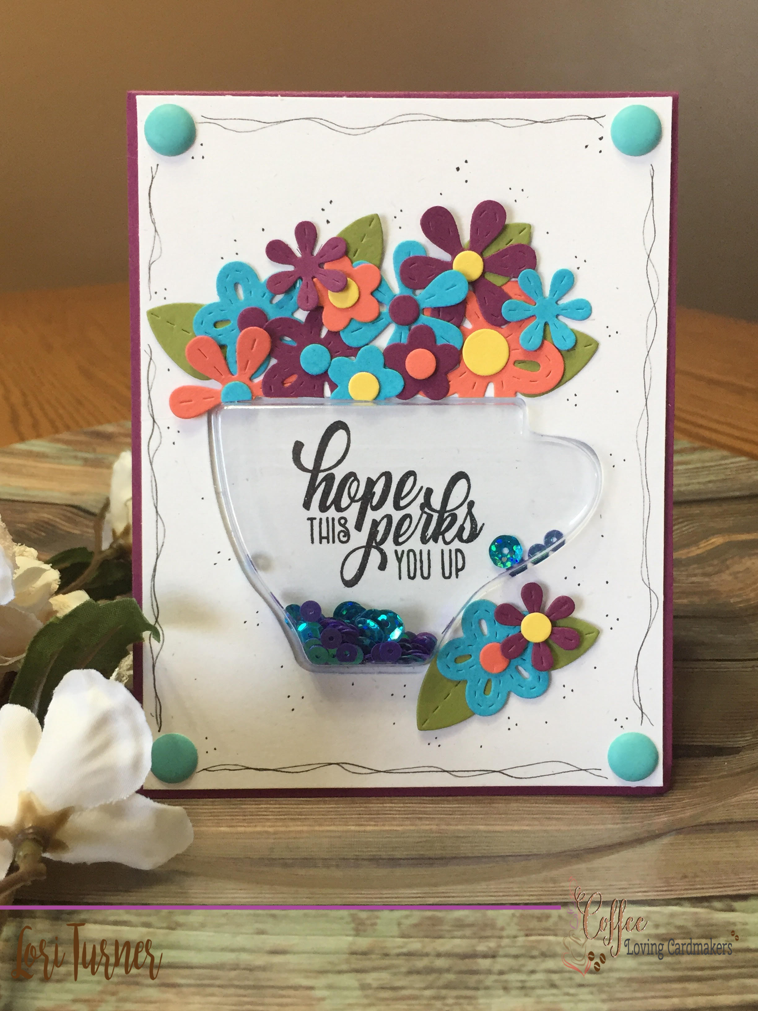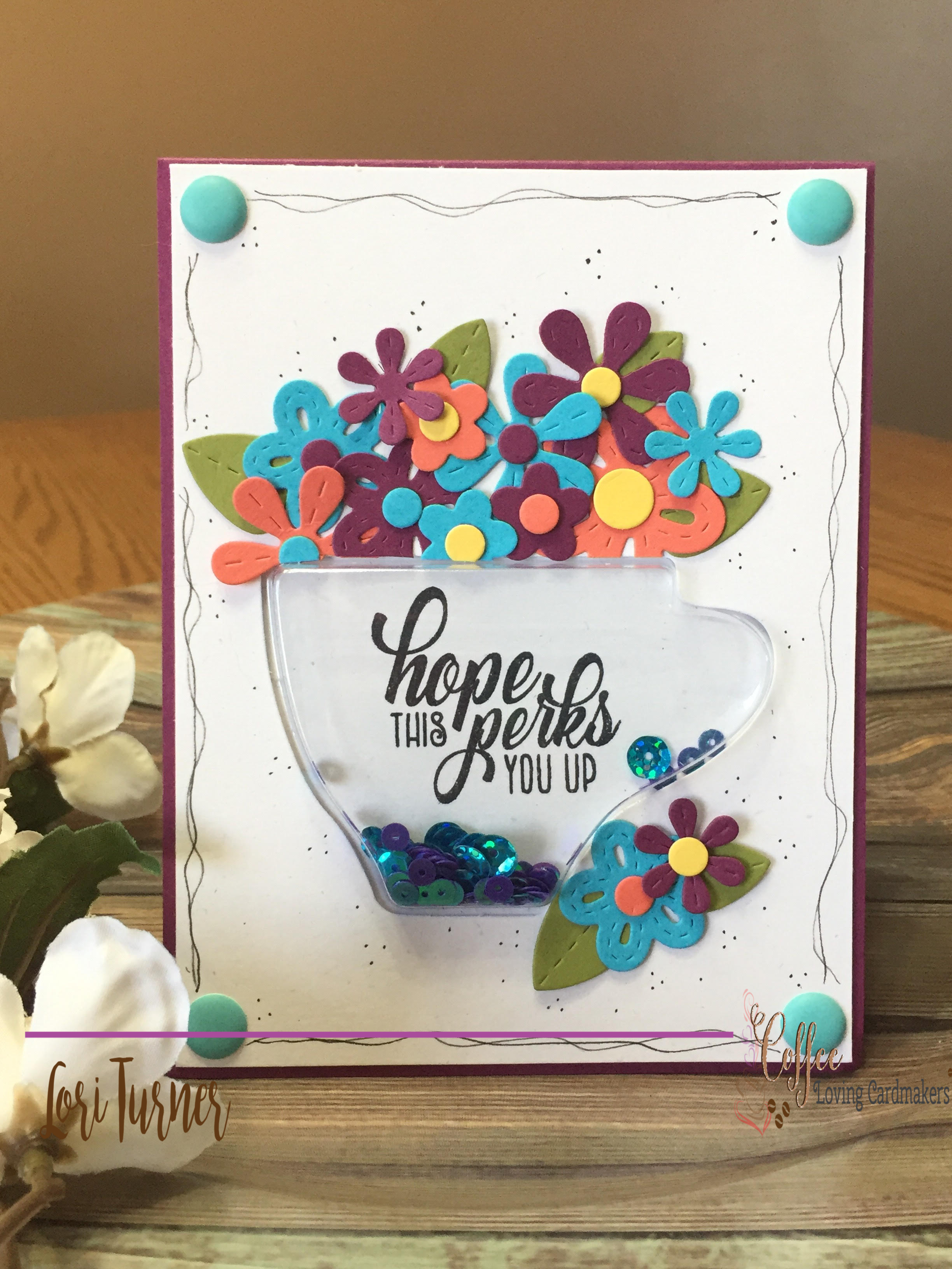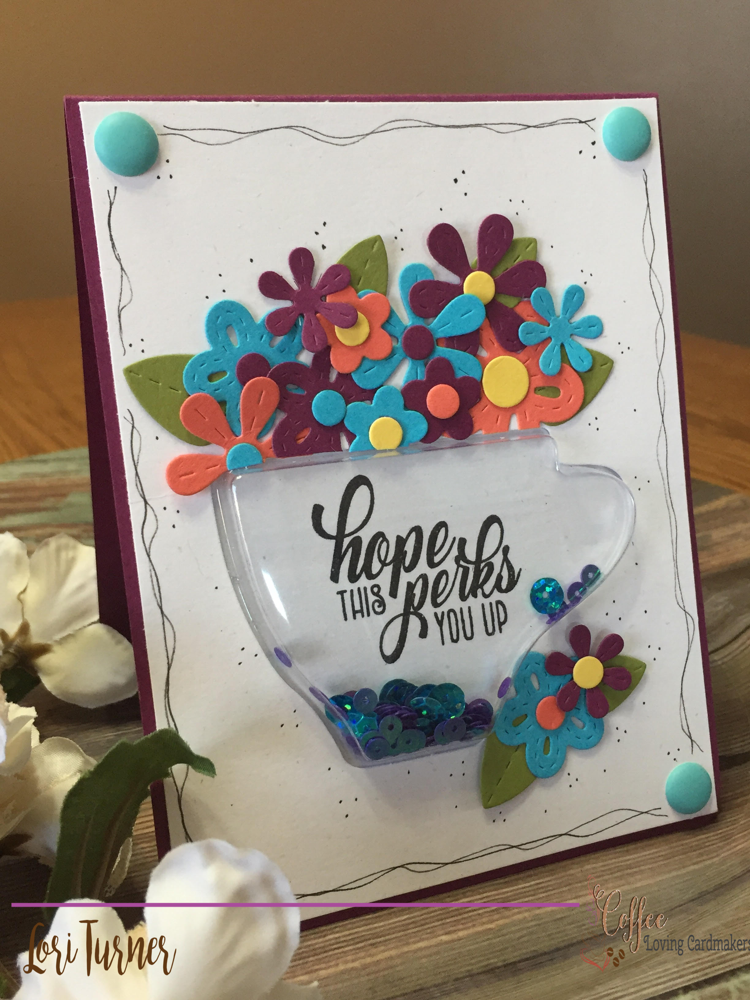 Welcome to today’s “Caffeinated Creativity” feature on the Coffee Loving Cardmakers Blog! Lori here and today I am excited to show you my super cute floral shaker card 🙂