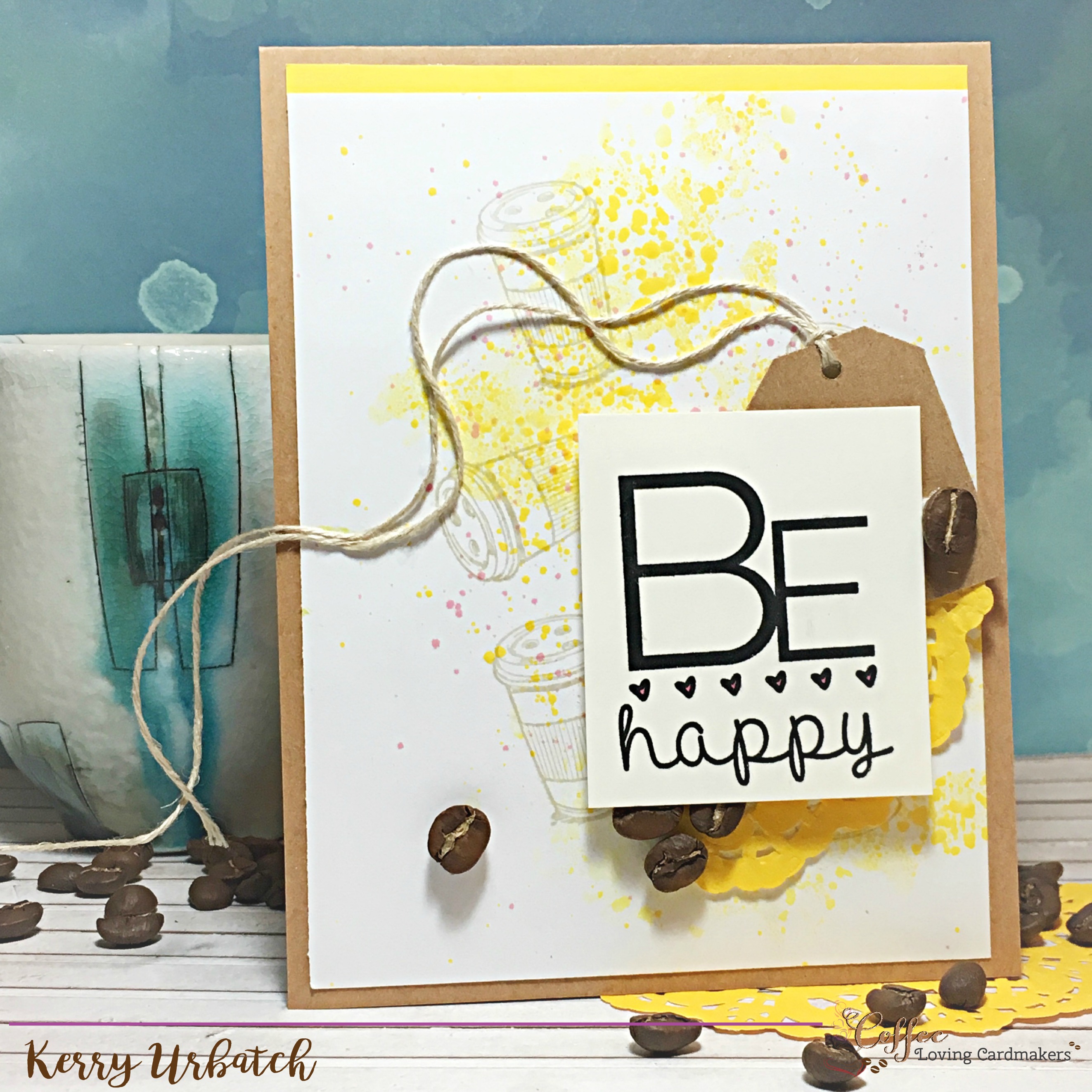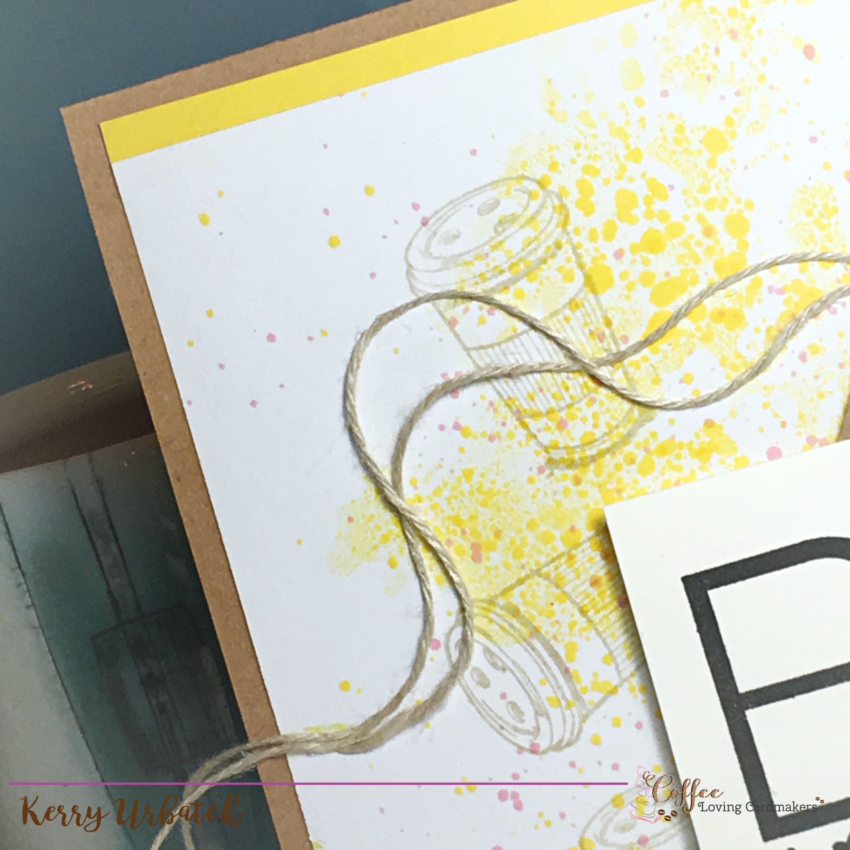 The sentiment was stamped with Black Licorice ink. The little hearts were colored with Bubble Gum Liquid Color. After creating the background “sunshine colors”, I stamped the to-go cup using Oatmeal Cookie ink. This gave somewhat of a muted image to the background and allowed the sentiment to take center stage. I added a Tag Time Punch (punch handle too) then incorporated a golden yellow doily and some Natural Thread to finish it off. Last but not least, I attached a strip of Lemon Drop cardstock to the top of the panel and attached the whole panel to a kraft card base.