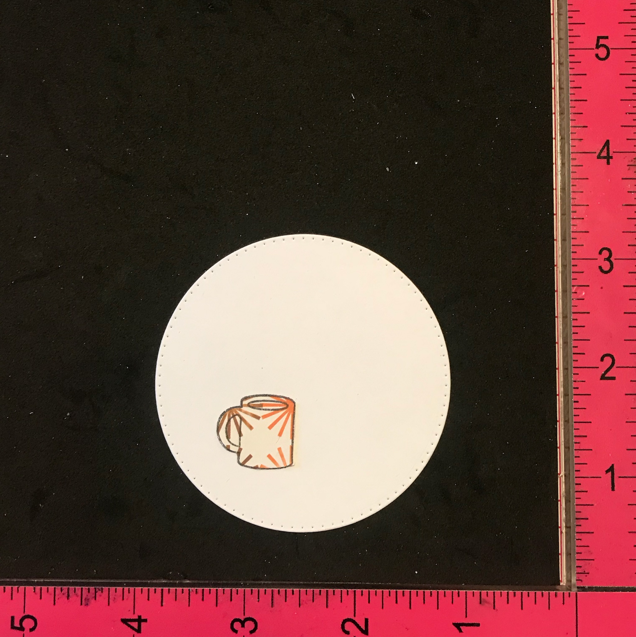 I started my card by stamping and masking a teeny tiny coffee mug from Poppystamps Cup of Cheer stamp set.