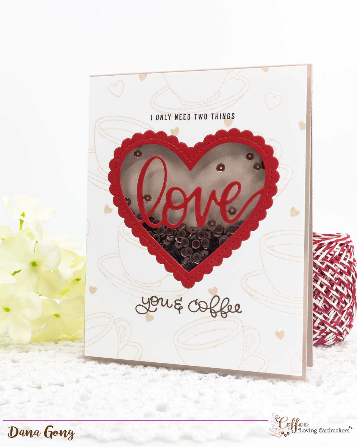 I started by creating my own background. I randomly stamped cup and heart images from Simon Says Stamp Coffee and Tea stamp set with MFT Natural Dye Ink. I die cut scalloped heart from background paper and a piece of red card stock using Pretty Pink Posh Love Shaker. I placed red heart instead of original one from background panel and taped behind the heart using paper tape. I then glued acetate on it using double sided tape.