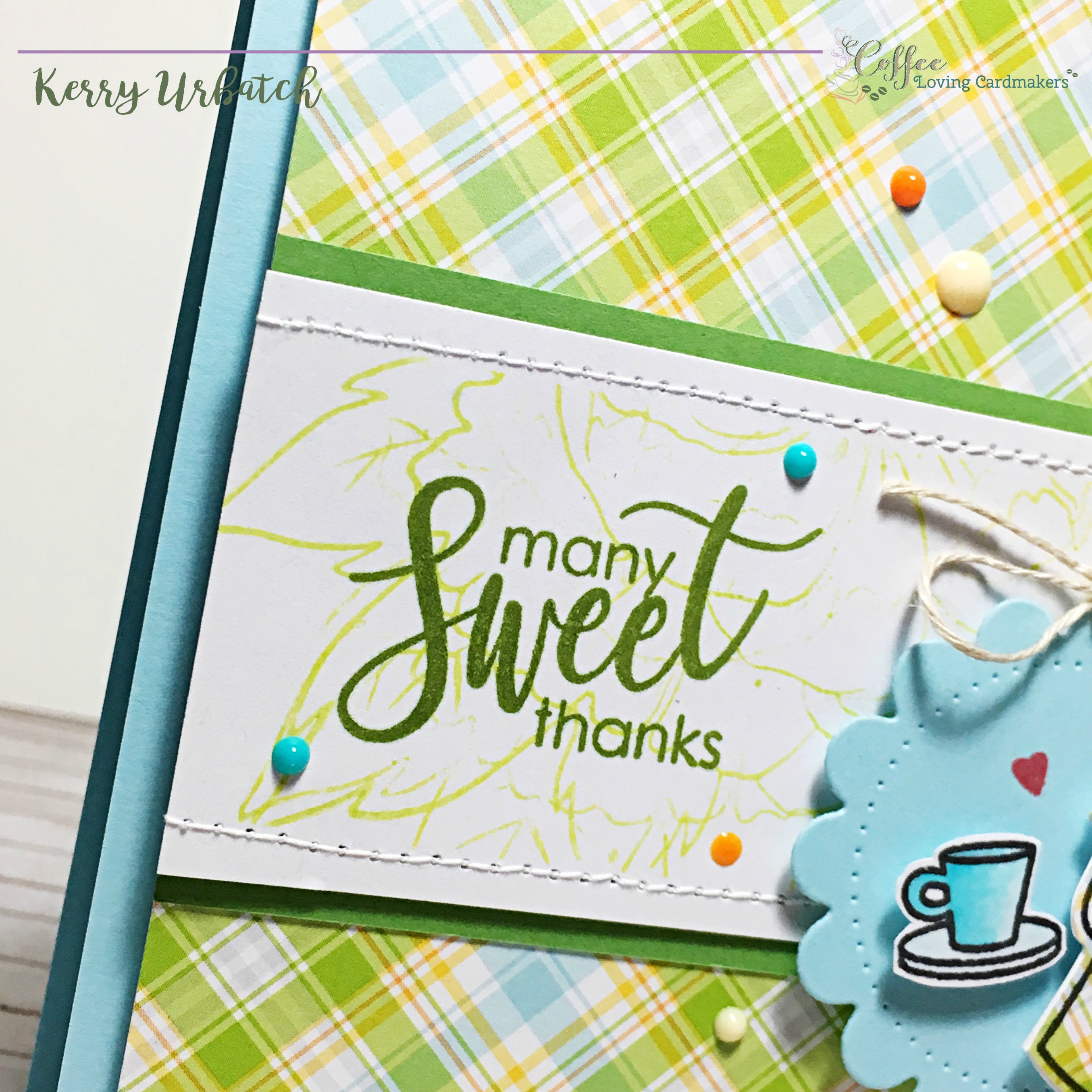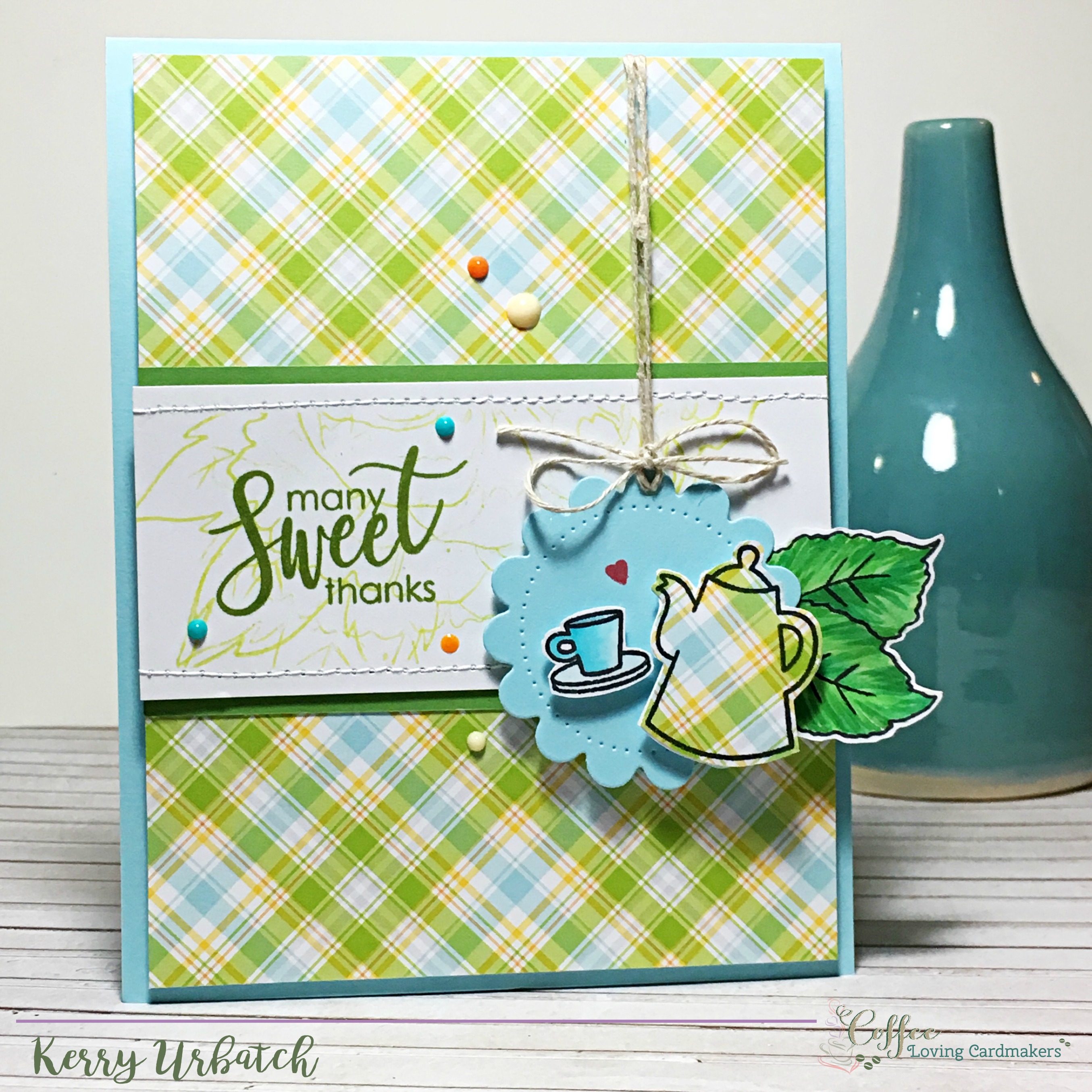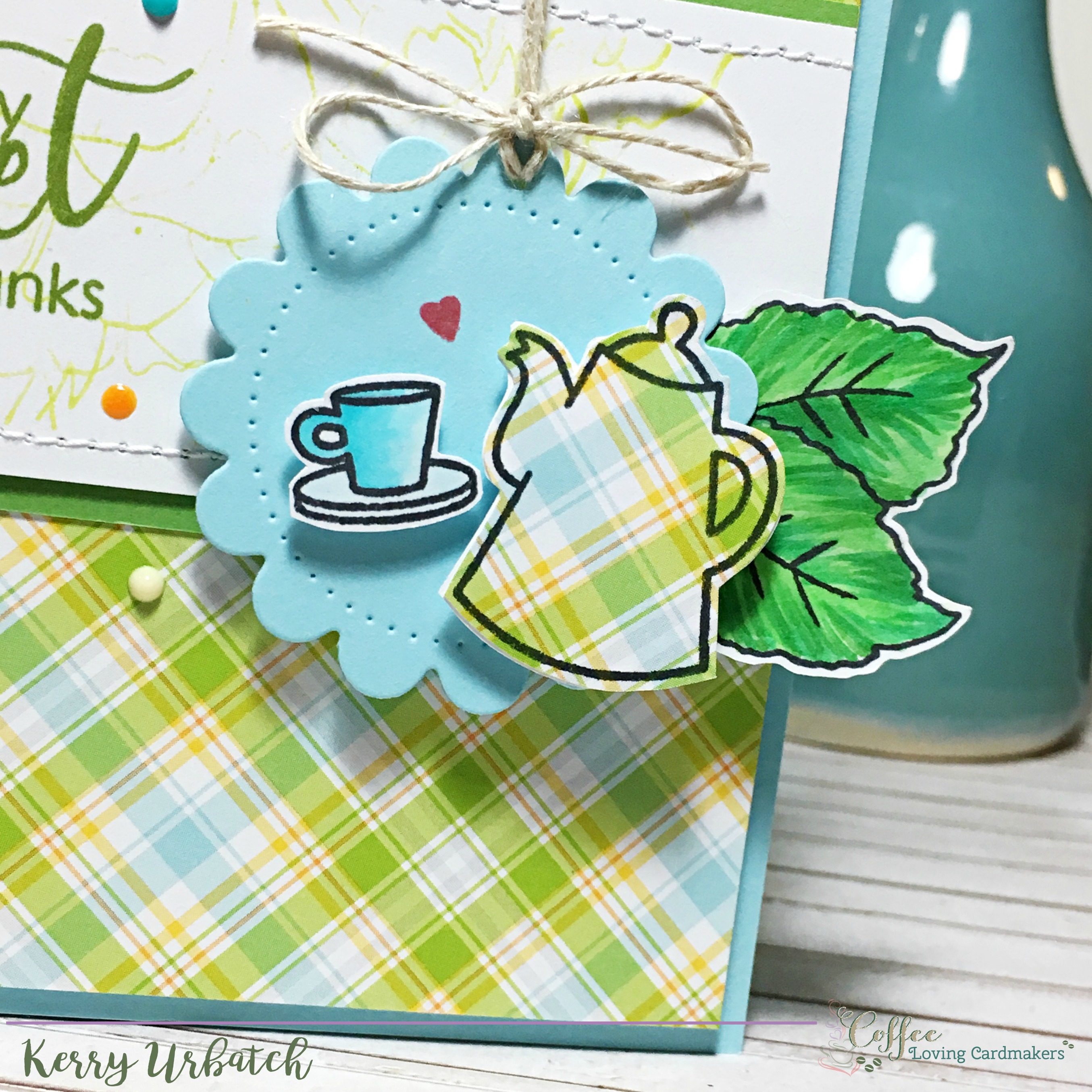 After attaching the diecut, I stamped the teapot and teacup (from the Sweet Latte set) onto the plaid paper and then the teapot onto white cardstock.  I colored the teacup with a little Copic coloring.