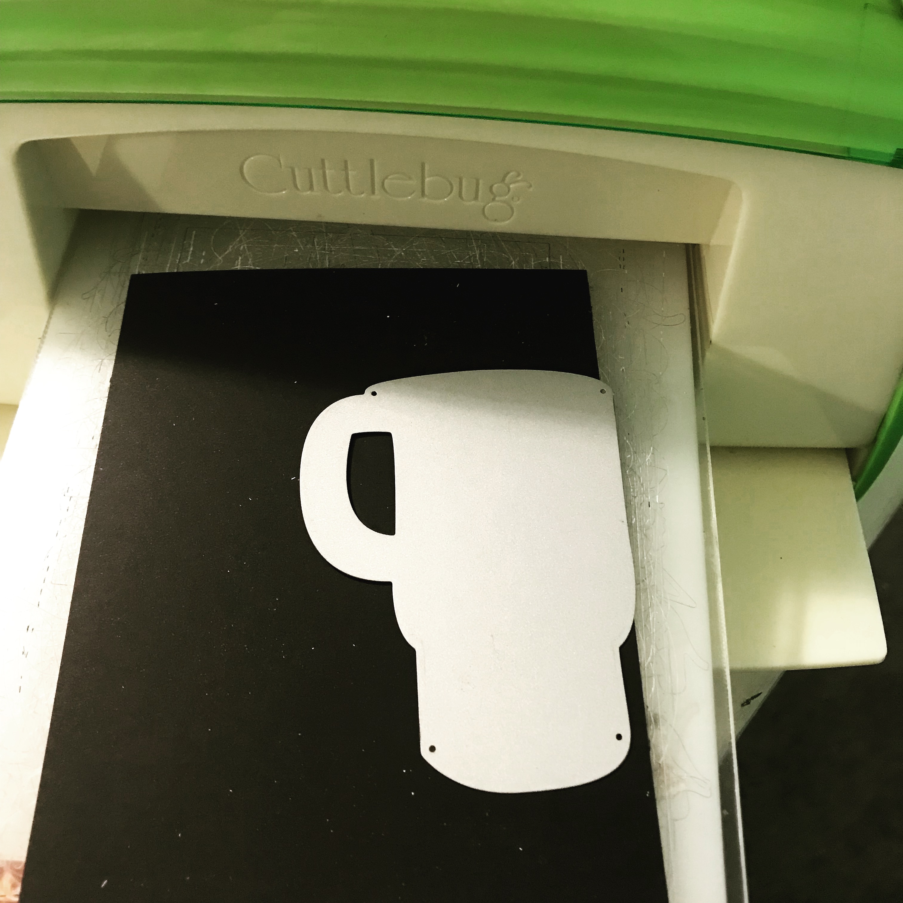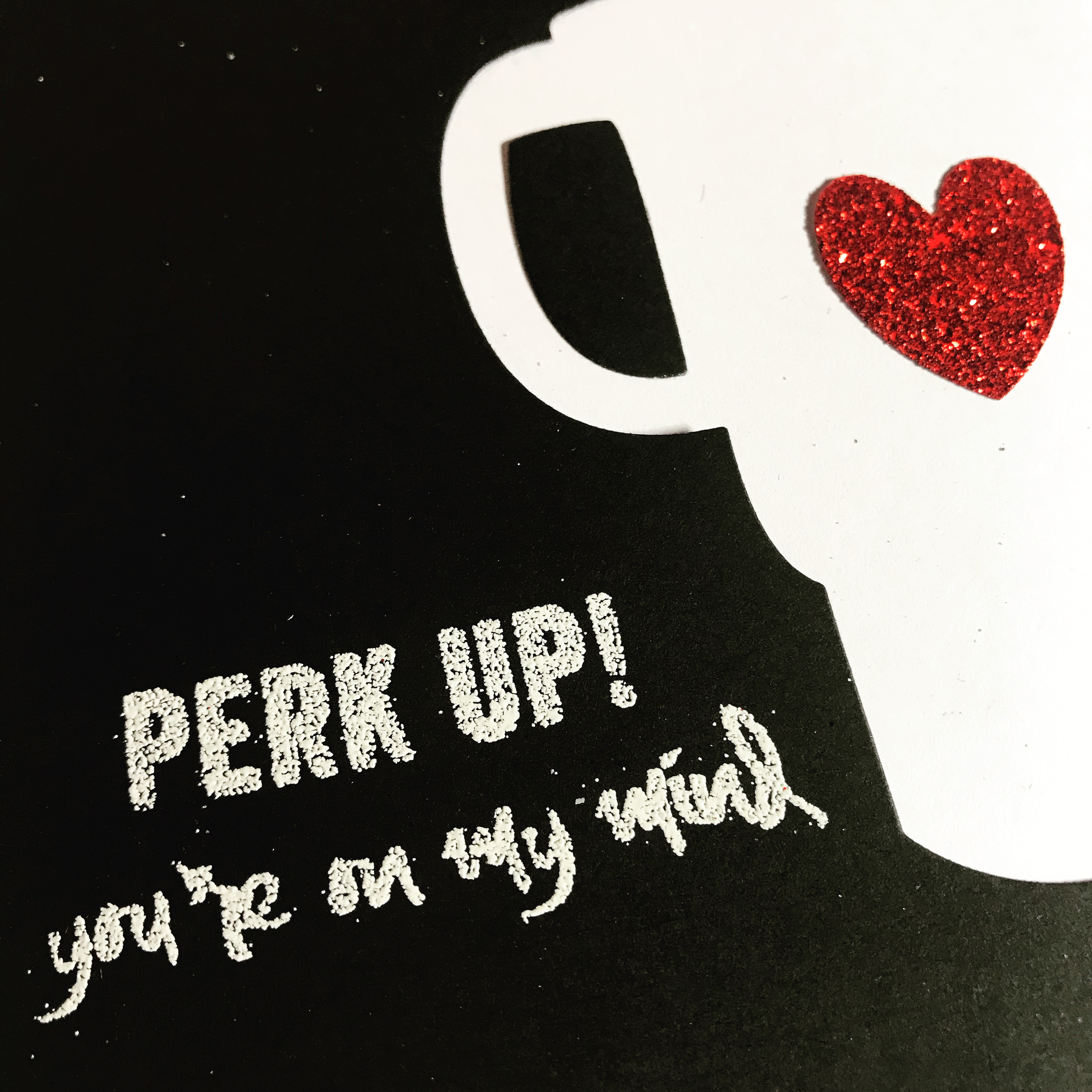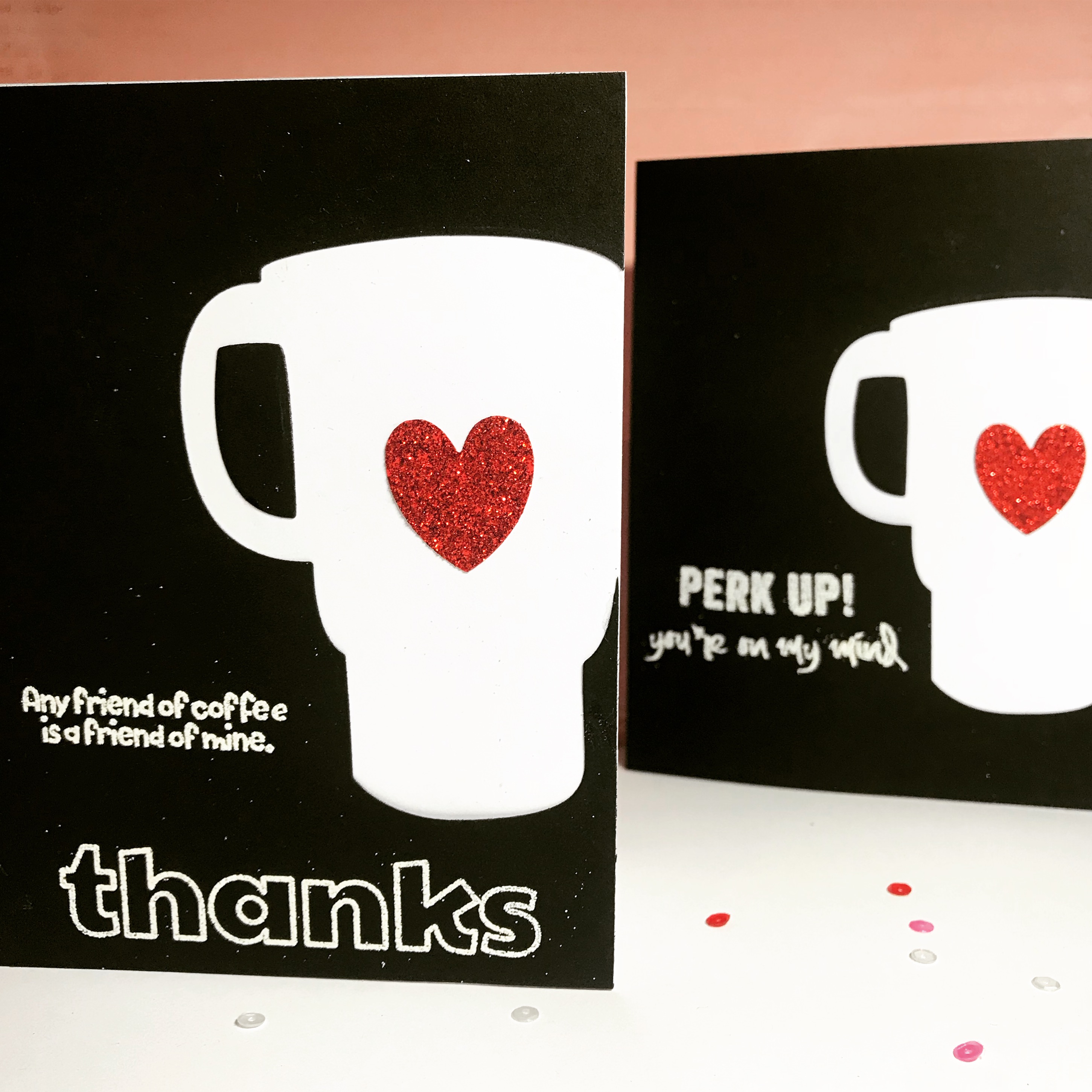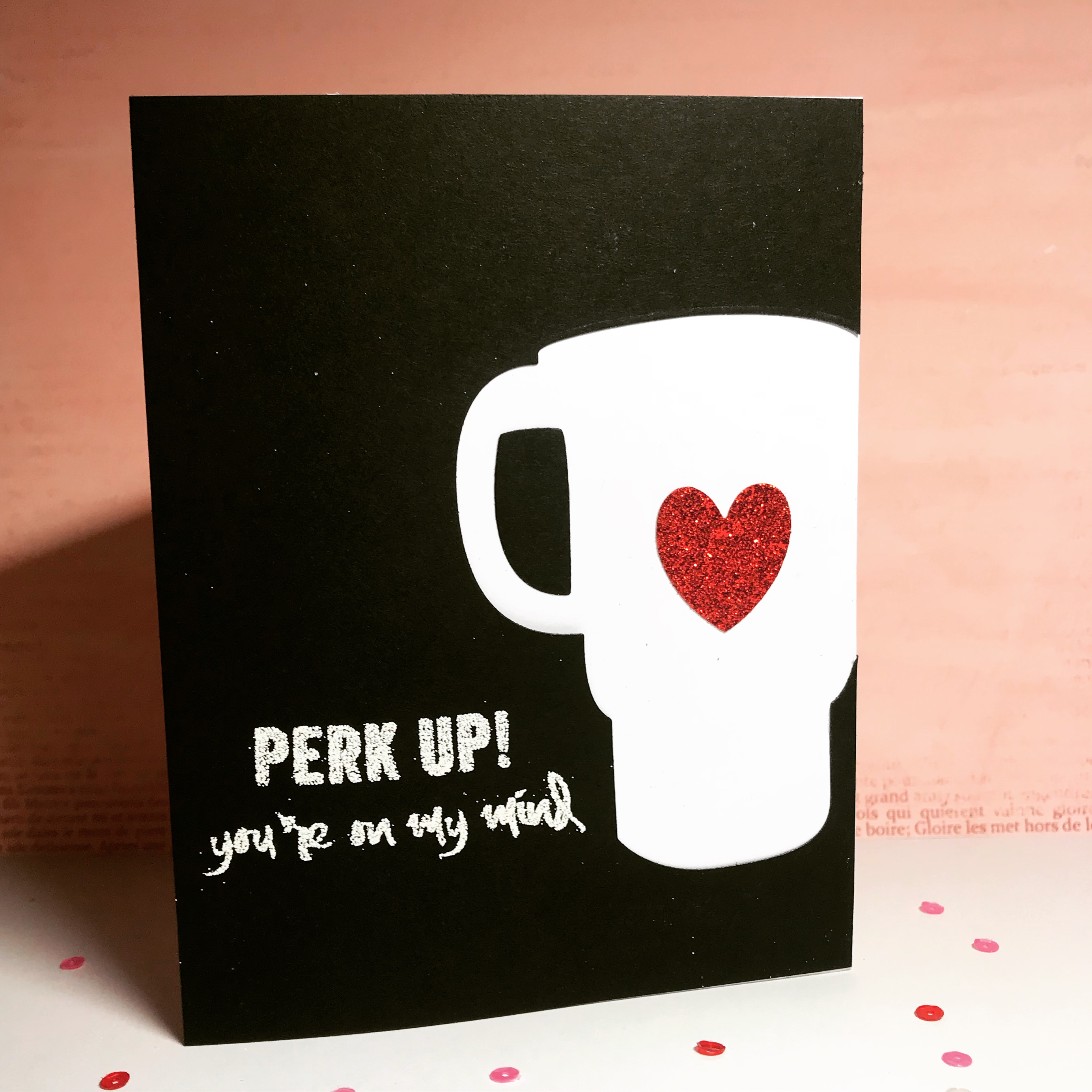I used the Anywhere There’s Coffee die set from STAMPlorations to create a negative die cut into a piece of stark black cardstock.