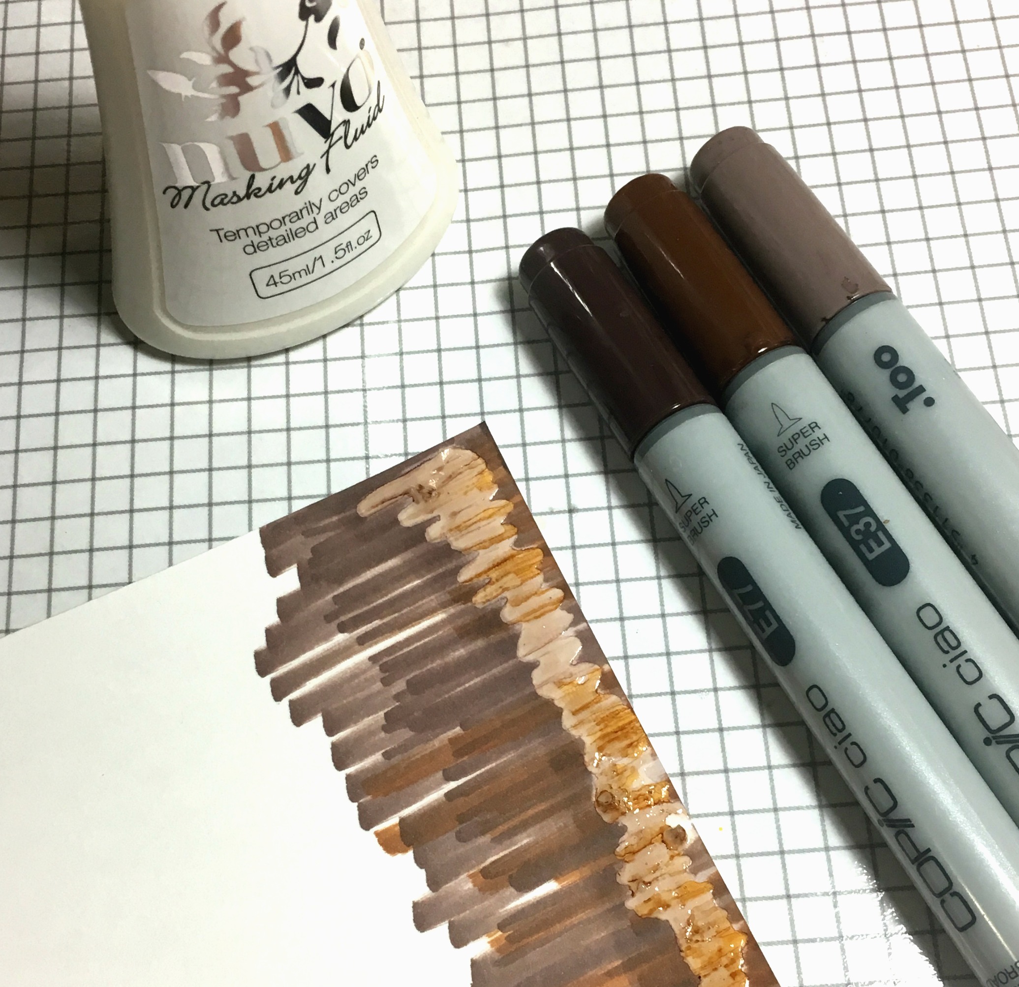 I started out by applying a little bit of Nuvo Masking fluid along the edge of some white cardstock.  I let that dry and then applied some copic markers over that to create a bit of a coffee color.  I rubbed off the rubber and then I started assembling the layers I wanted for my card.