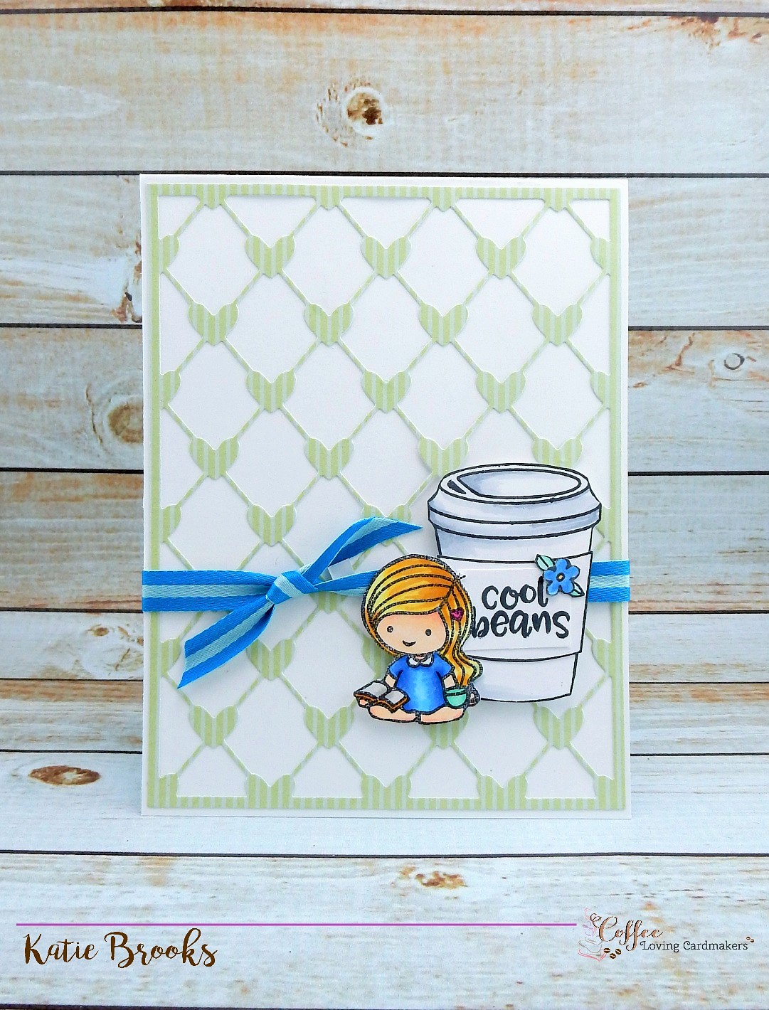 Right, doesn’t she look like she is in a transcendent state?! I am guessing it is the mass quantities of coffee!!! This sweet girl is from Love Cynthia. She is partaking in one of my favorite pastimes…reading while drinking coffee (preferably on the deck in the sun). I colored her using Copics. The colors she is wearing perfectly match the Avery Elle Cup and flower. I added this background die from Memory Box in this green paper from Crafter’s Companion. The ribbon is the final flourish.