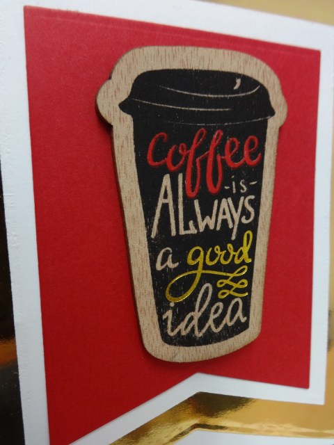 I started my card by cutting out panels with my My Favorite Things Fishtail Flag dies and then stamping my cups and coffee beans along the bottom of my white background. I adhered my wood veneer coffee cup and wa-laa!! Done! So cute and fun to make.