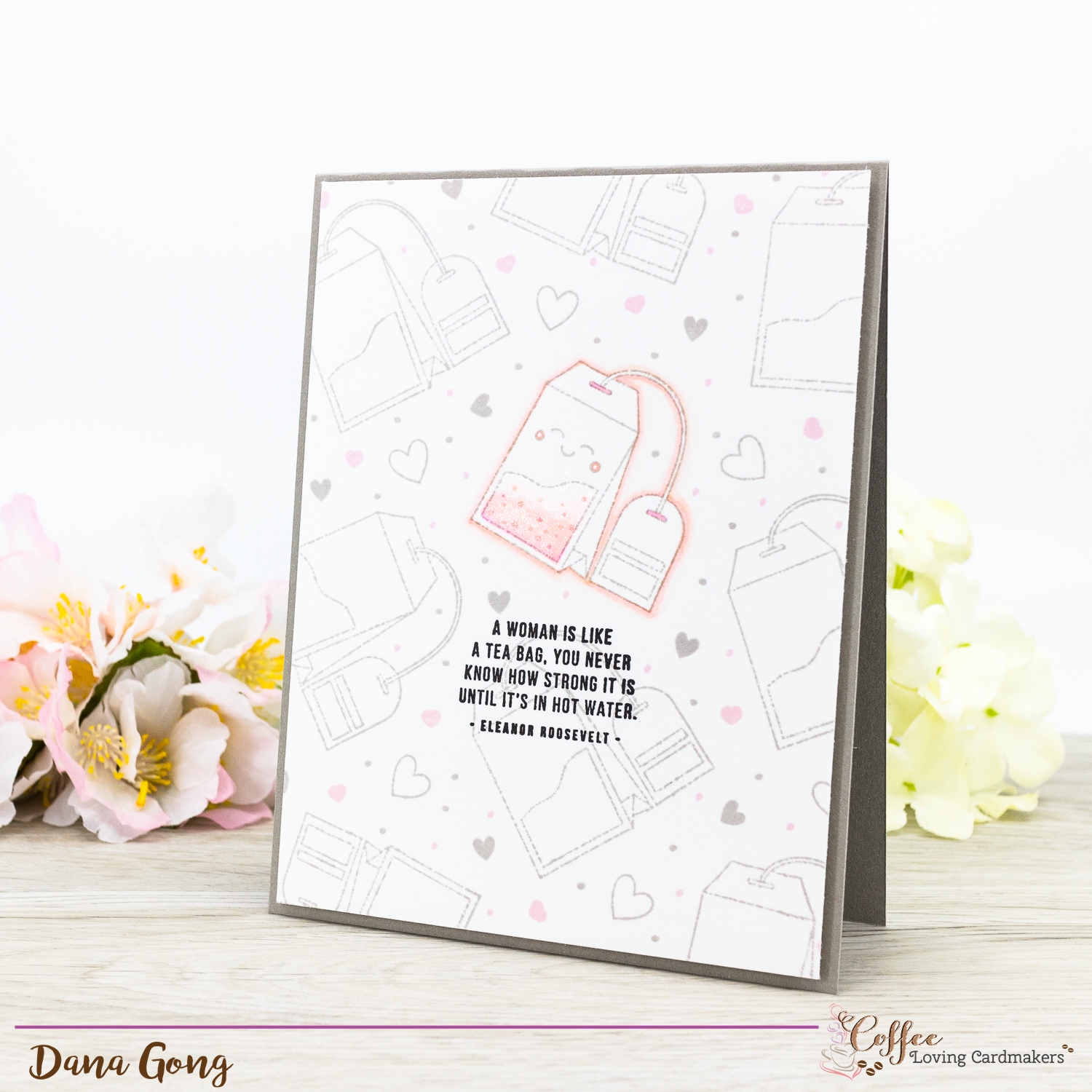 I highlighted center tea bag image by adding pink colors and shades using copic markers. I applied white gel pen and Spectrum Noir Clear Overlay to tea bag as well.