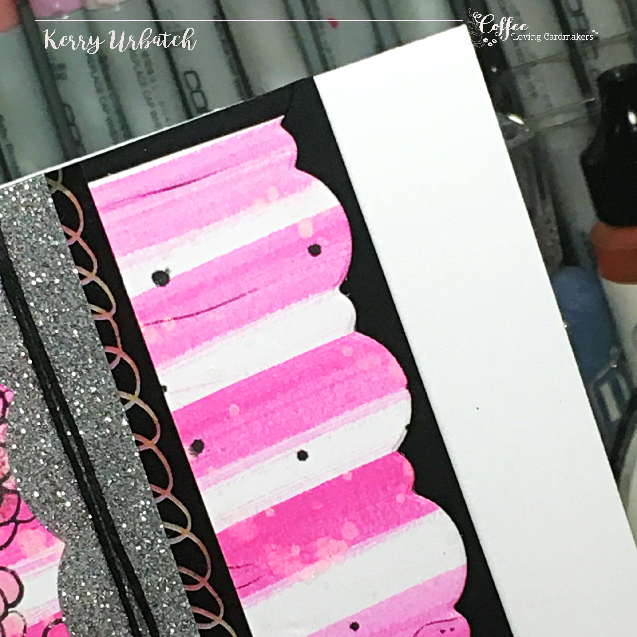 I splattered some Whip Cream Silk, Black Licorice and Sparkle Silk (Fun Stampers Journey) onto the panel to add a bit of sparkle then added some washi tape from my stash (Fun Stampers Journey.  I painted the flowers with a light touch of Bubble Gum Liquid Color too.  After that, diecut the panel with a fun scalloped die from Fun Stampers Journey.