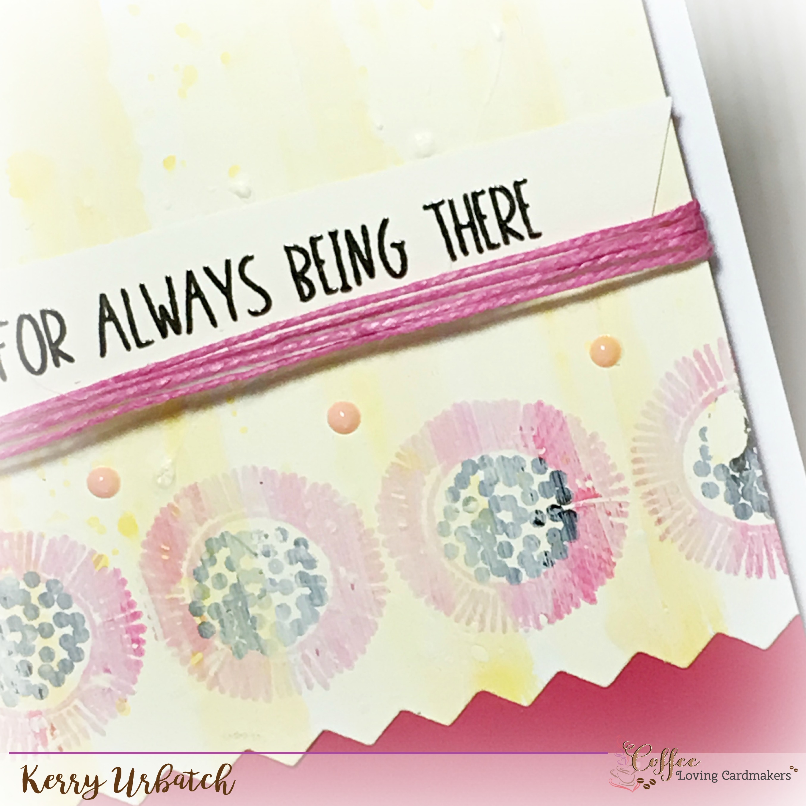 Hello there Coffee/Tea/Cocoa loving crafty friends! It’s Kerry here and I’m back with another fun Sunday Sip! Today I decided to get the watercolors and acrylic paint out for my project. I watercolored (using FSJ Liquid Colors) some yellow stripes on a piece of white cardstock. Then, I added some ivory acrylic paint over that to mute the color down. After the paint dried (with a little help from my heat gun), I stamped the fun little “floral elements” from an older Neat and Tangled set called Scandinavian Prints using VersaFine Clair Charming Pink and Versafine Onyx Black. I heat set it and added some ivory acrylic paint over that to push the image into the background a bit.