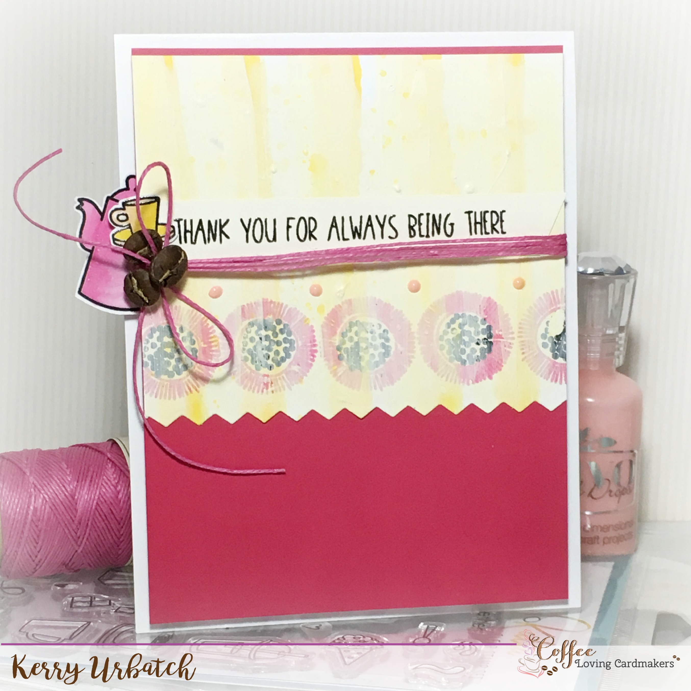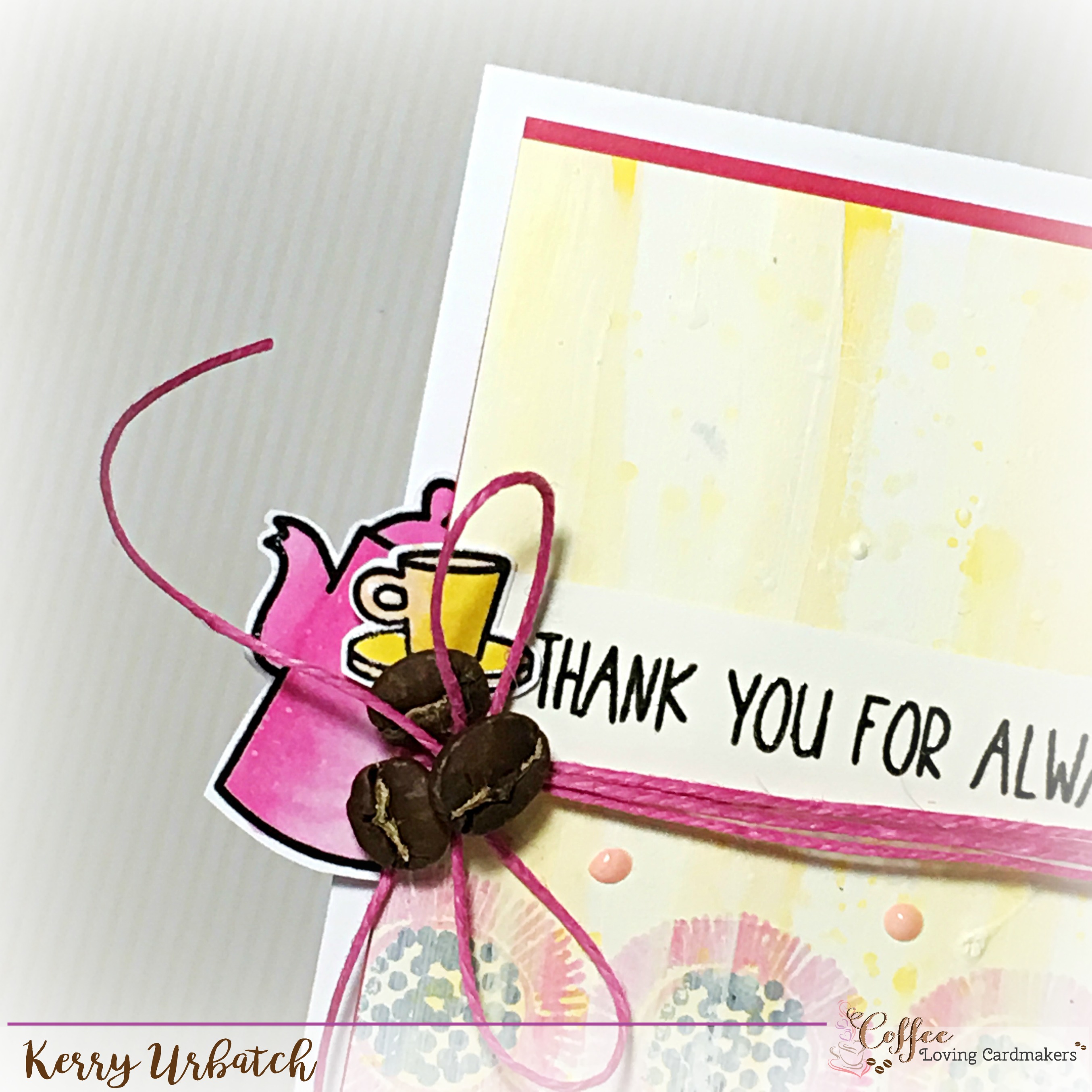 To finish the card off, I diecut (using a ric-rac die from Right at Home) attached the panel to the pink base panel and attached the sentiment, Hemptique twine, the coffee items and of course my favorite embellishments…coffee beans! Hope you enjoy!