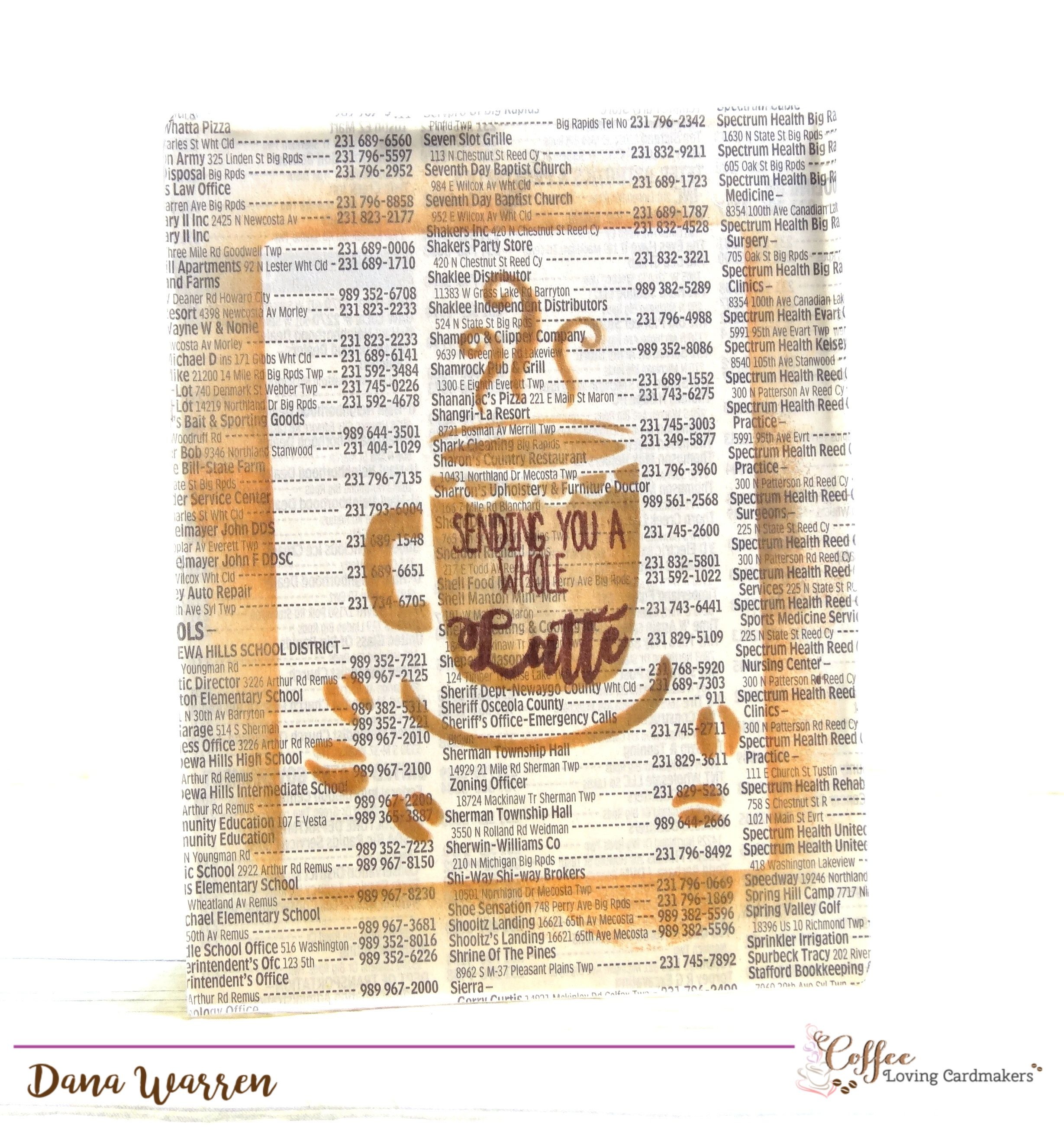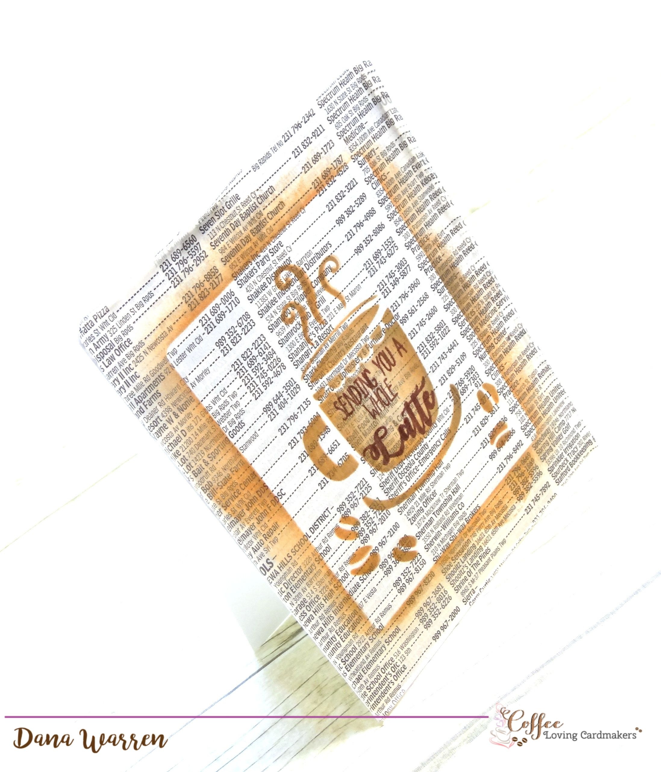 Next, I used Joy Clair’s Coffee Lovers stamp set to stamp the Sending You A Whole Latte inside the cup. I used a darker brown ink, Dark Cholcate from Papertrey Ink. I decided to keep it simple, so last I adhered the phonebook page to a white card base, then I roughed up the edges a little!