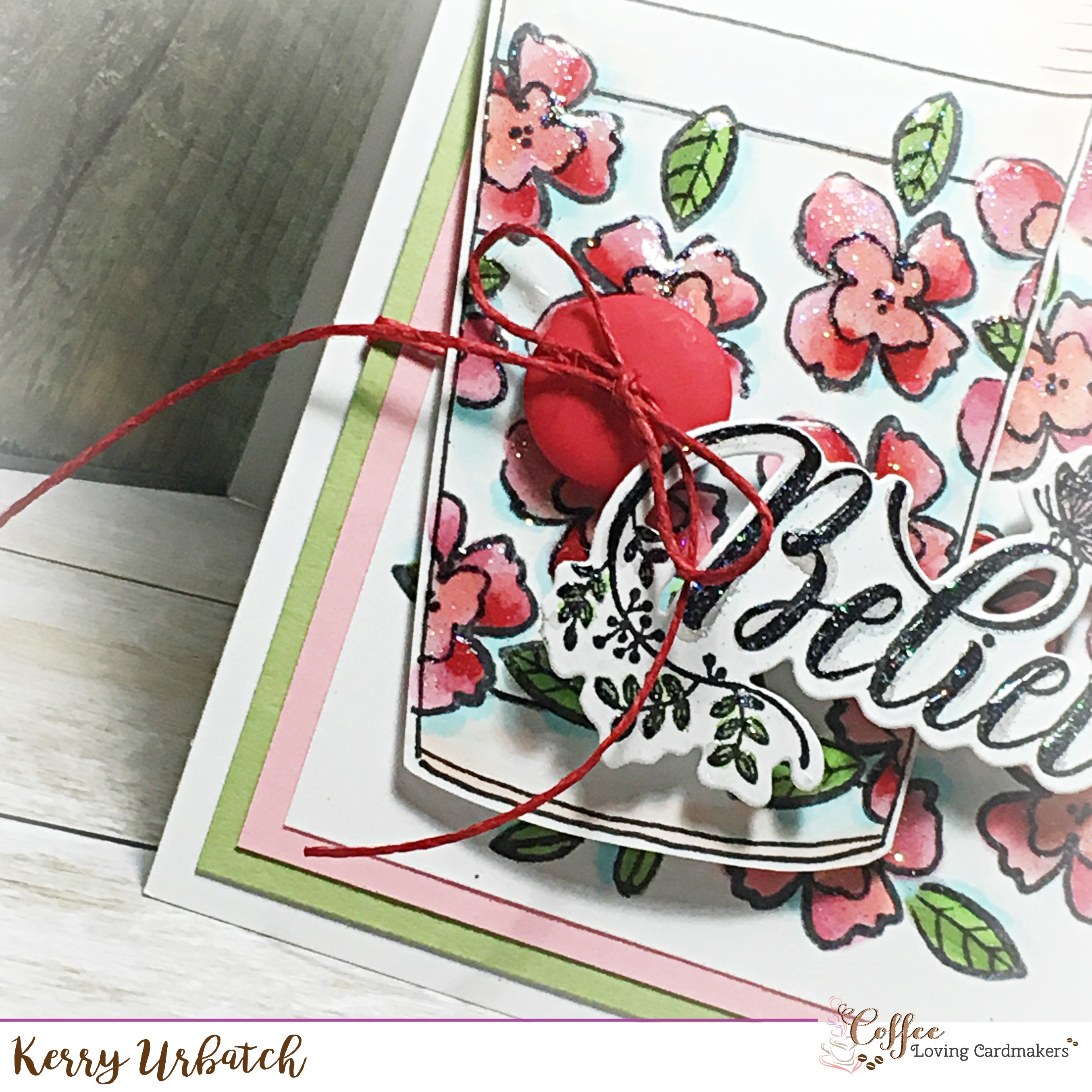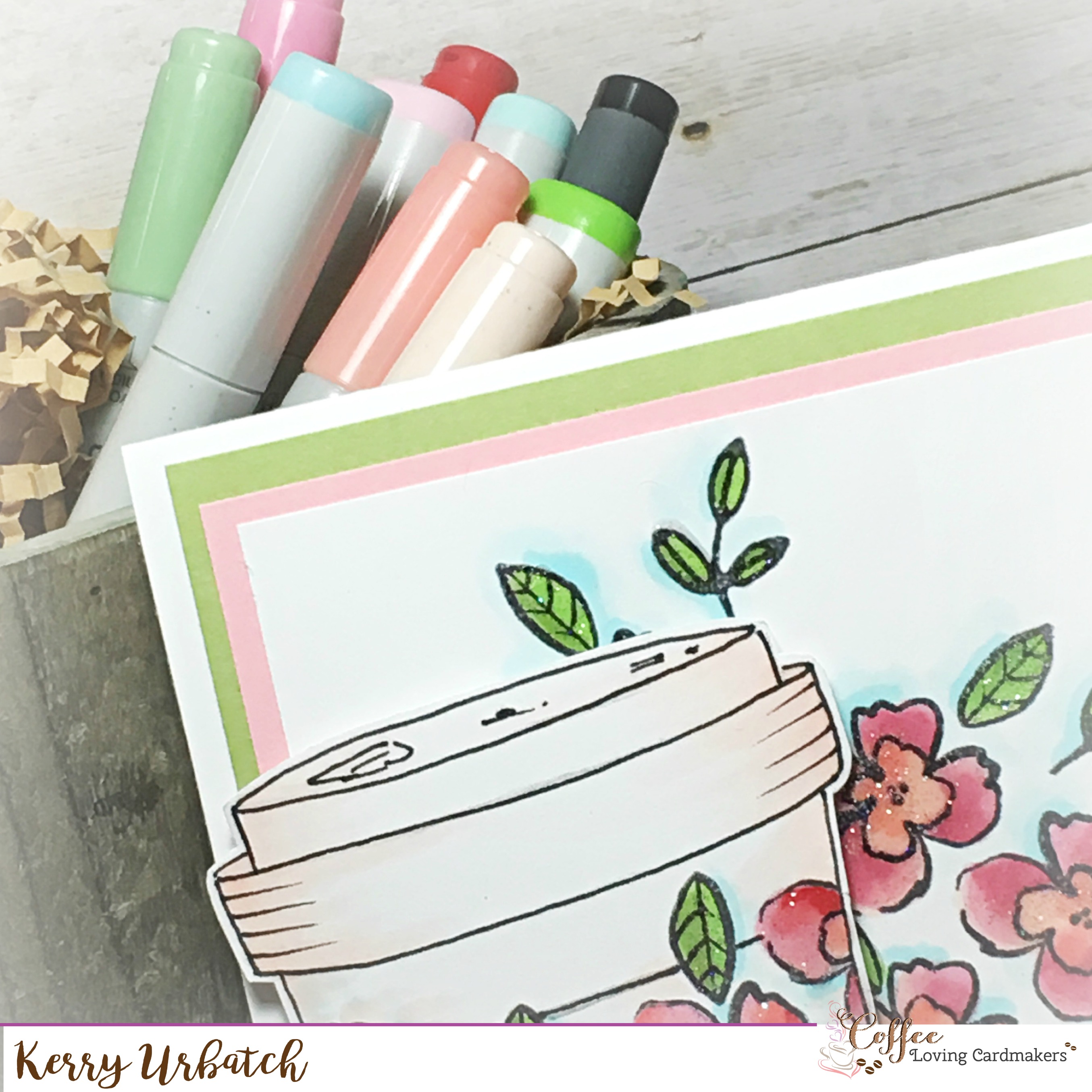 Hello there Coffee Loving stampers! It’s Kerry here and I’m back with another fun Sunday Sip! I recently got this gorgeous Pinkfresh Studio stamp set called Believe (Word Series) and Die and I had this idea to fill a cup with the pretty posies that were available in the stamp set. They reminded me of the flowers that grew on my Grandma and Grandpa’s crabapple trees in Iowa and I loved seeing them bloom each spring/summer. Sooo… I decided to color them the pretty pink I remember!