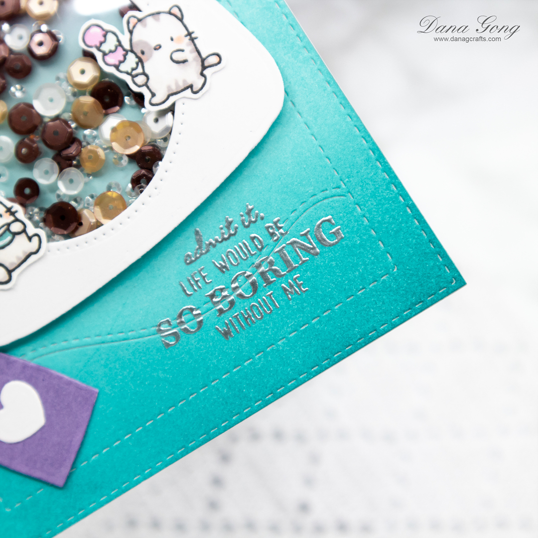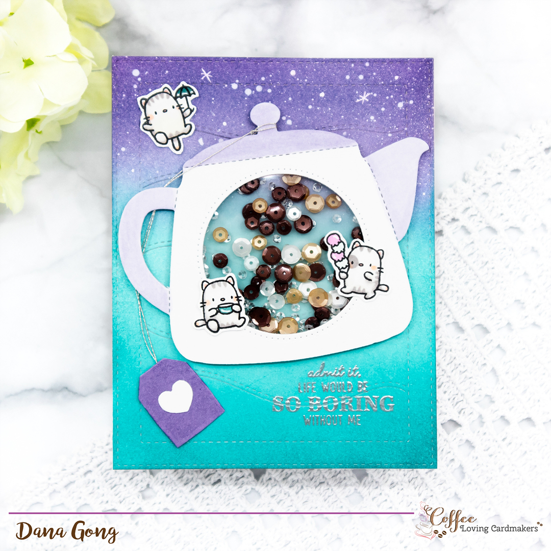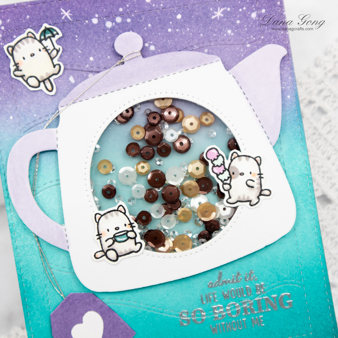 Next, I die cut tea pot using Mama Elephant Tea Time Die Set and Studio Katia Dotted Patterns : Fancy Circle for shaker window. I colored tea pot with Copic markers and made it as a shaker using foam adhesive and Neat and Tangled Coffee and Cream Sequin Mix.