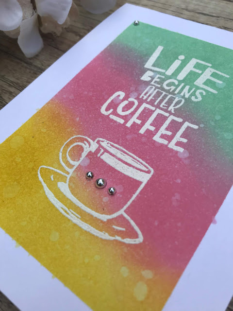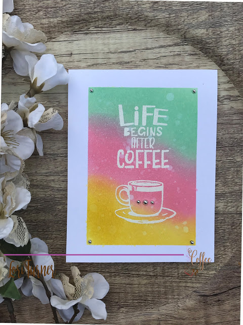 I dug out my silicone mat, 3 pretty colors of Distress Oxide (Cracked Pistachio, Mustard Seed and Worn Lipstick), “Coffee Helps” stamp set from Fun Stampers Journey, some paper towel, and a water spritzer then got busy! So fun!