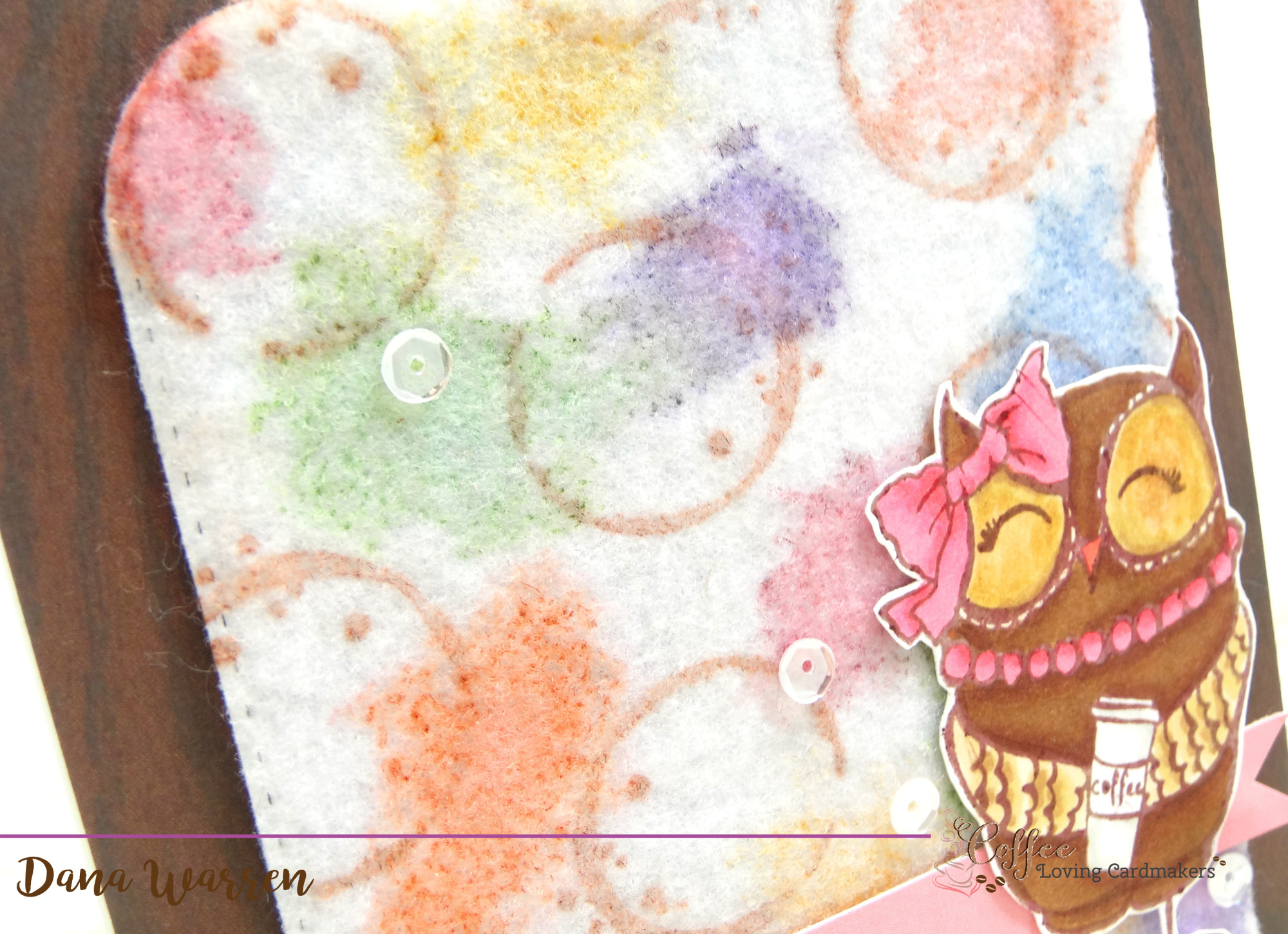 I started my card by die cutting a rounded rectangle from white felt. Then I stamped coffee rings randomly on the felt. I used Fun Stampers Journey Coffee Helps stamp set. Then I got to thinking, it looked a little plain with just the white and coffee rings. I wondered what happened if I tried to watercolor on felt??? So I pulled out my Papertrey Ink re-inkers, picking out rainbow colors of a purple, green, yellow, orange, blue and red. And I just added a little bit of the concentrated ink and water. I used the paintbrush to dab and push the ink out, adding water helped dilute the ink and spread it around. The water and ink kind of soaked into the felt where it was the most saturated.