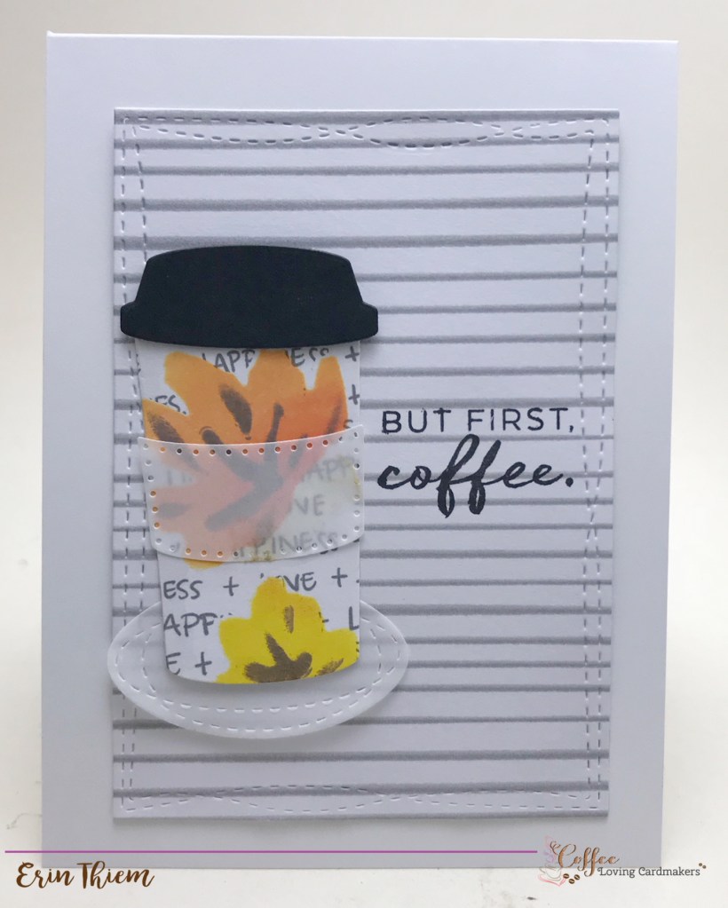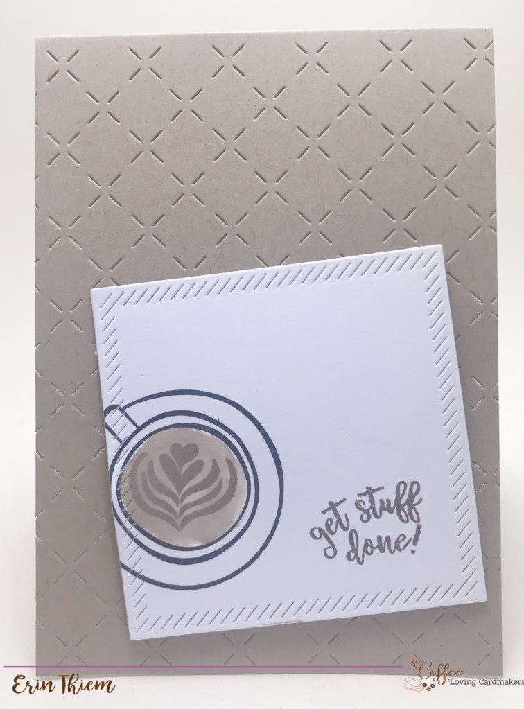 Hello, Erin, from Homemade Cards by Erin here. I’ve got two CAS cards today— I love what happens when you pair the sentiments together as a bit of a pep talk. My first card combines the Concord & 9th stencil and paper set with Fun Stampers Journey coffee die and an Ellen Hutson sentiment. I also used some My Favorite Things dies. See what happens when you have a robust coffee crafty collection? You can make super simple cards 🙂 My second card uses the Hero Arts Monthly kit, a My Favorite Things die and a ‘Lil Inkers cover plate. Happy Saturday crafty coffee friends!