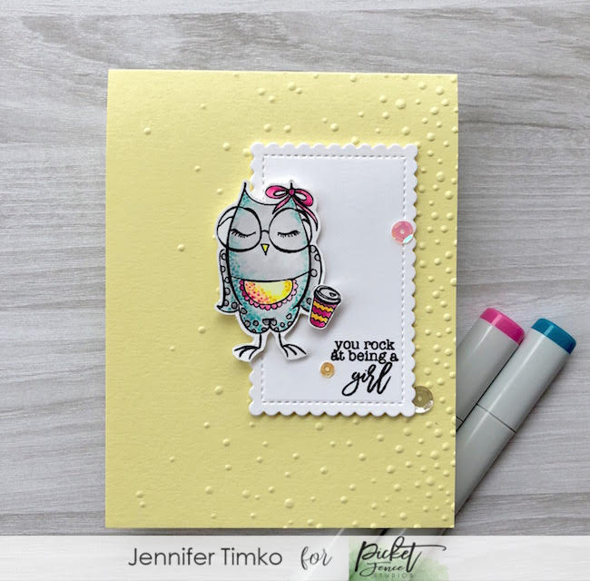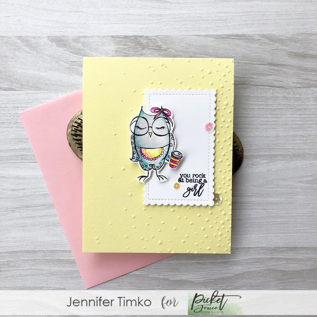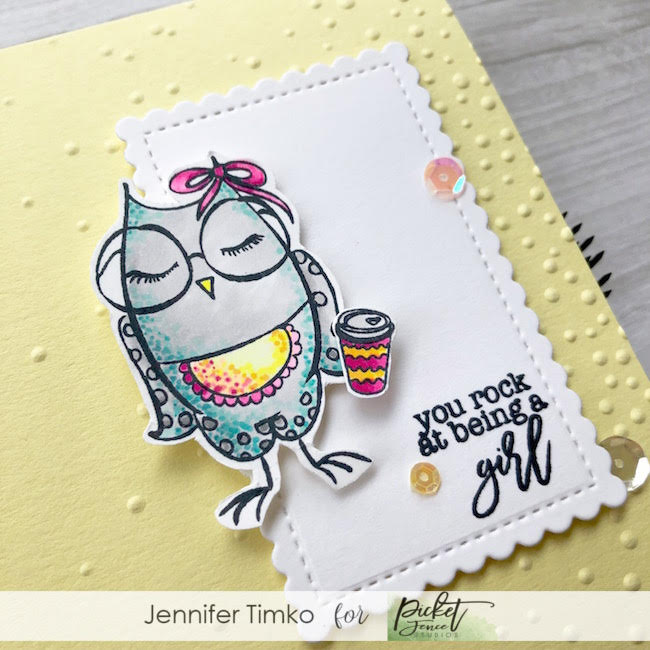 I fussy cut the images and then chose to use a Stitched Scallop Rectangle for a layer. The sentiment comes from a new set being released today by Picket Fence Studios. It is called Louise from the #girlboss series. I added a little texture to the Lemon Card Stock with the Softly Falling embossing folder by Stampin’ Up. Finally I added a few sequins in coordinating colors.