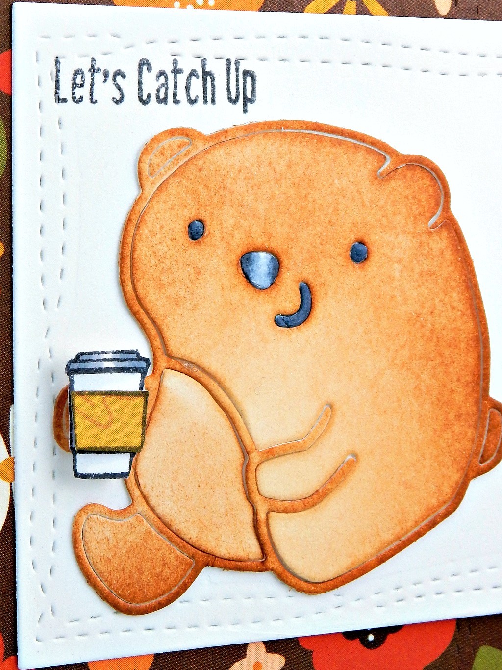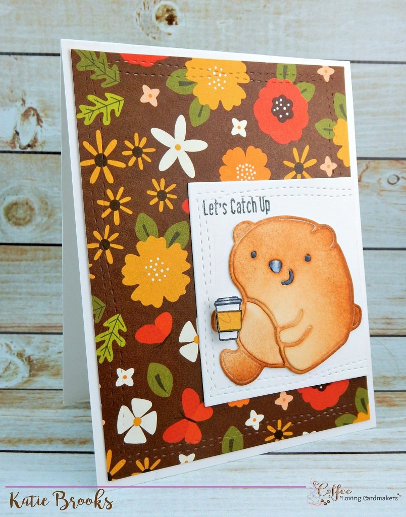 I love this Paper Smooches bear die.  I recently picked it up from Drive By Crafts, I have coveted it for so long, it was time I finally purchased it.  I used my Vintage Photo Distress ink to color it and used markers for the nose, mouth, etc.  You might be wondering where that flower is the bear usually holds… well I cut it off because this bear is in need of a bit of coffee to help him hunt for food and add a little more chunk before winter’s hibernation.  The cup and sentiment are from The Greeting Farm.  I used my Avery Elle wonky stitches on the white square and the backdrop DP.  Here is another shot of that bear.